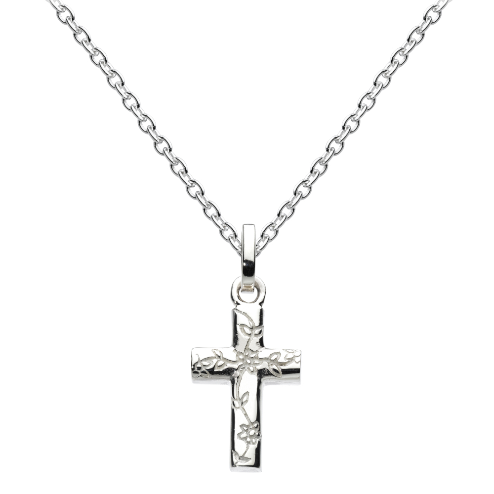 Attractive solid sterling silver cross pendant with intricate flower engraving.
