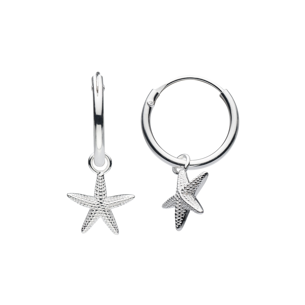 Dew. 13mm sleeper hoop earrings with a starfish drop. Stirling silver.