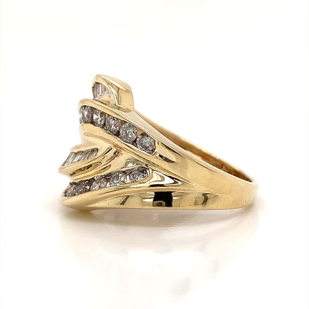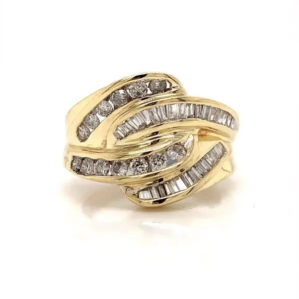 A statement dress ring with an interlinked loop design – half channel set with round brilliant cut and half with baguette cut diamonds.
