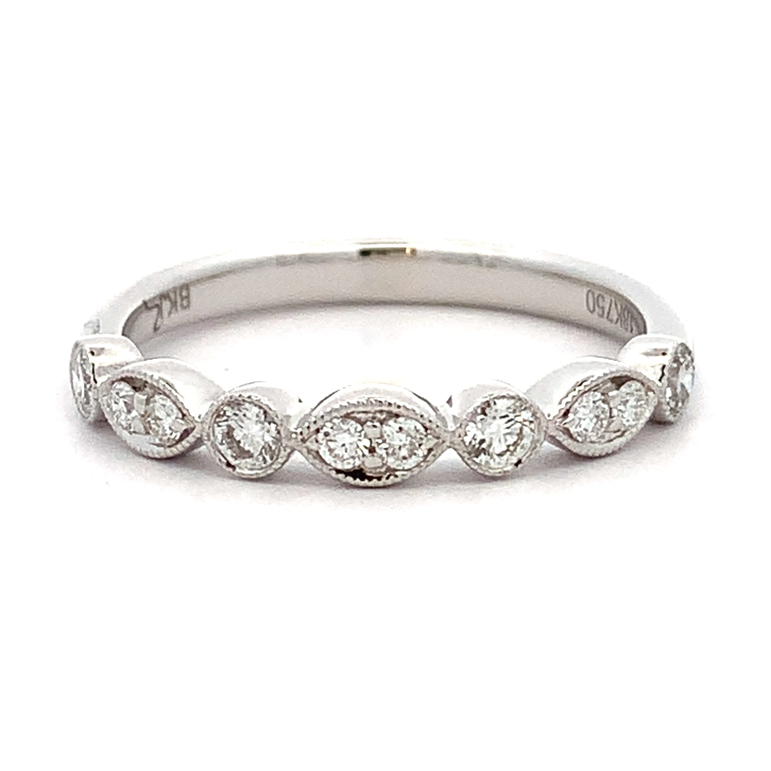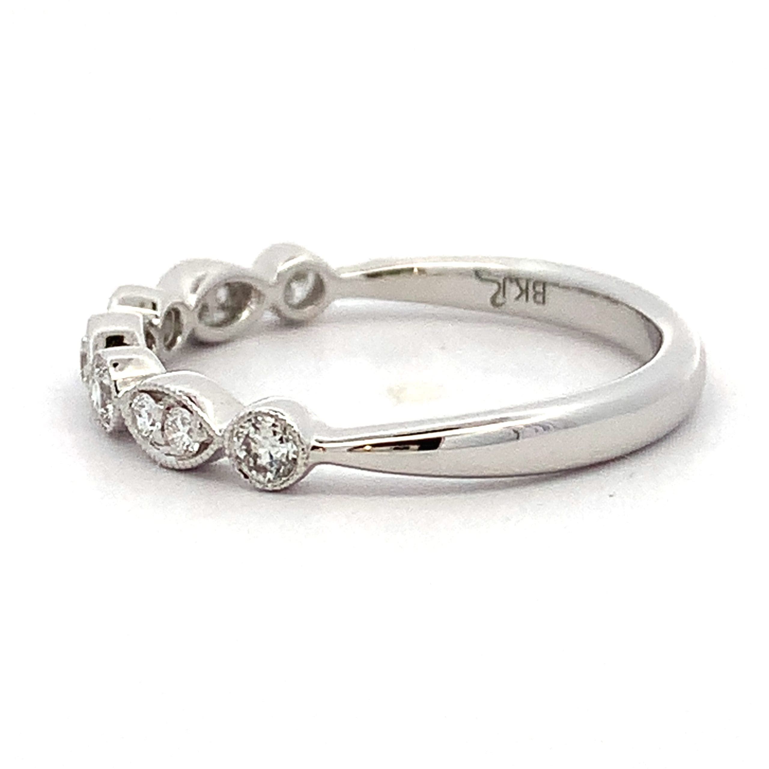 A very pretty white gold eternity ring with bright, round brilliant cut diamonds in shaped milgrain edged settings.