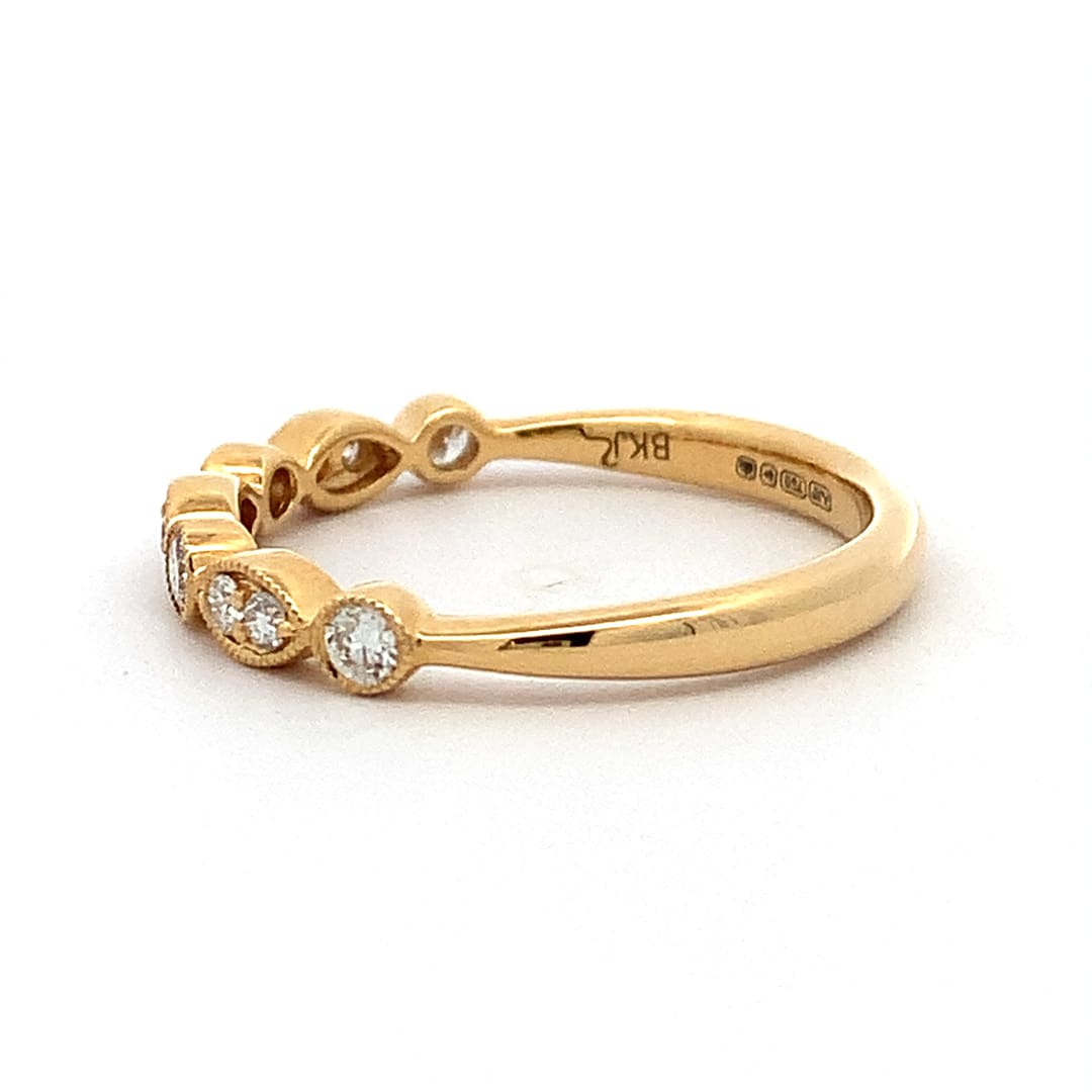 A very pretty yellow gold eternity ring with bright, round brilliant cut diamonds in shaped milgrain edged settings.