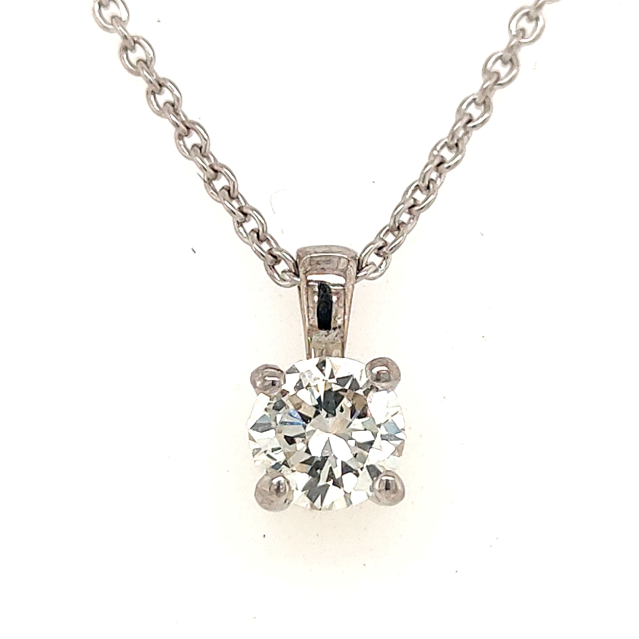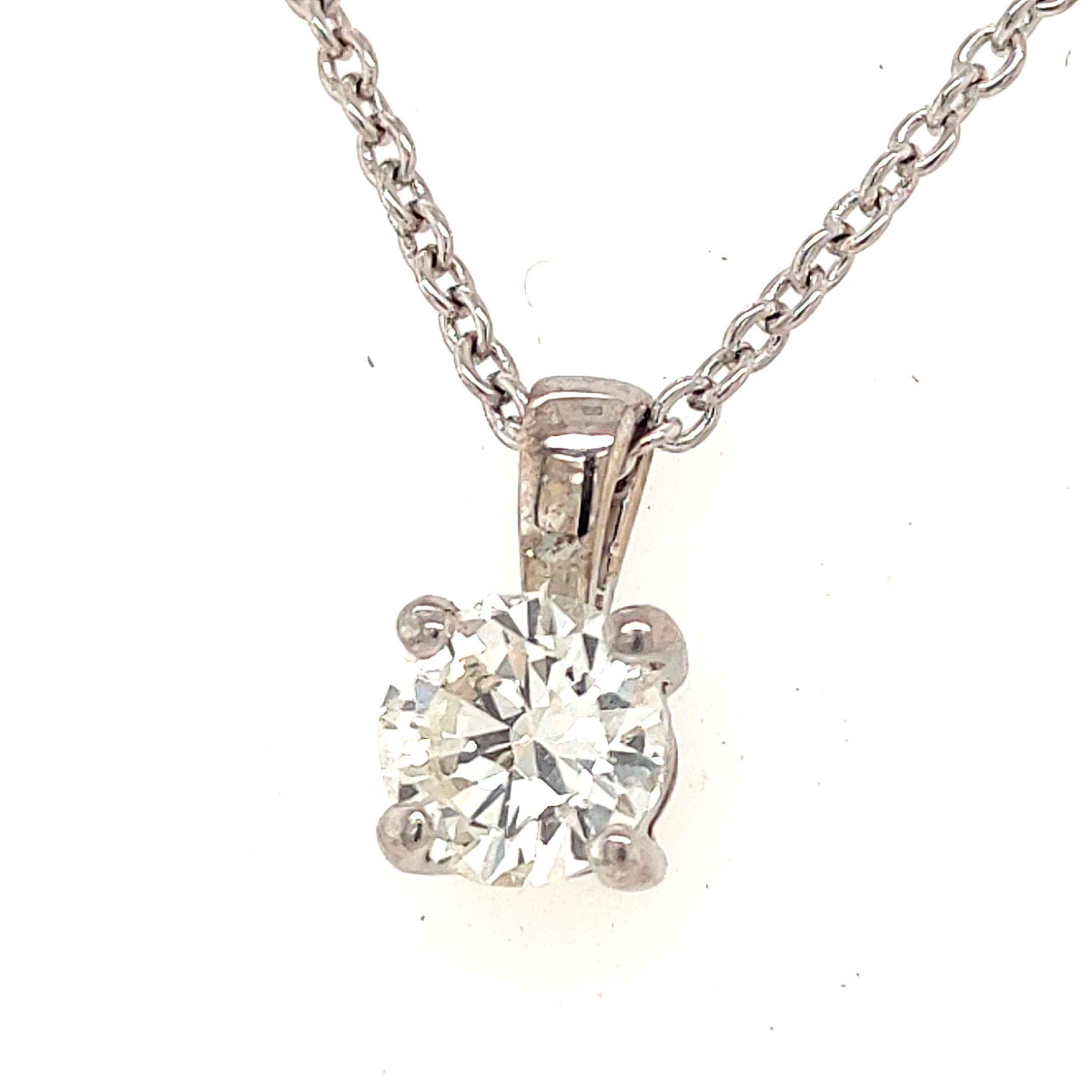 A traditional diamond solitaire pendant in a claw setting on an 18 carat white gold trace chain.