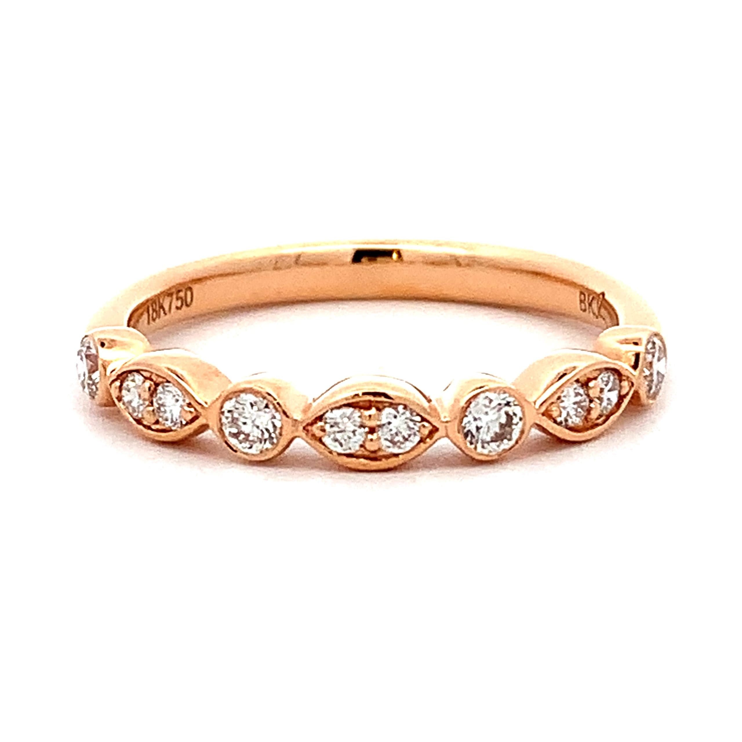 A very pretty rose gold eternity ring with bright, round brilliant cut diamonds in shaped settings.