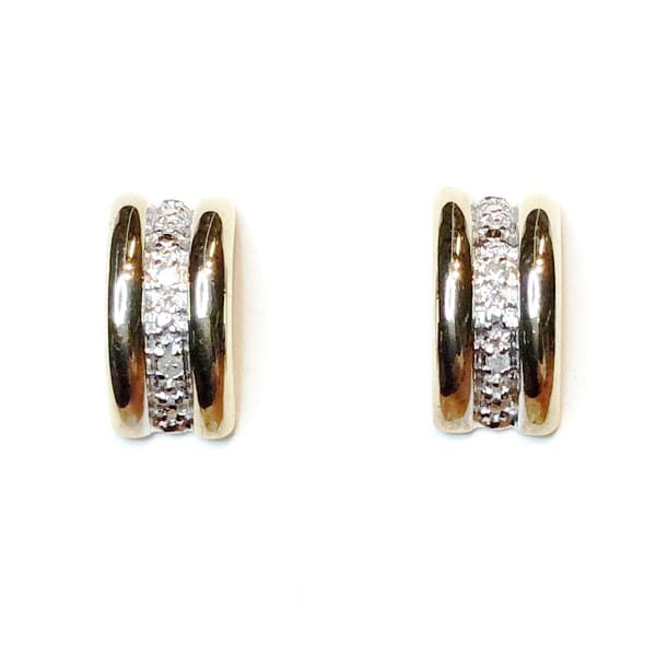 Attractive yellow gold curved front earrings each set with two small round Diamonds within illusion settings.Metal:  9 Carat Yellow GoldDate:  ModernLength:  11.5 mmFittings:  Posts and Scroll BacksAs a preowned item, these earrings have been examined and professionally cleaned and polished in our workshop.Gift Boxed