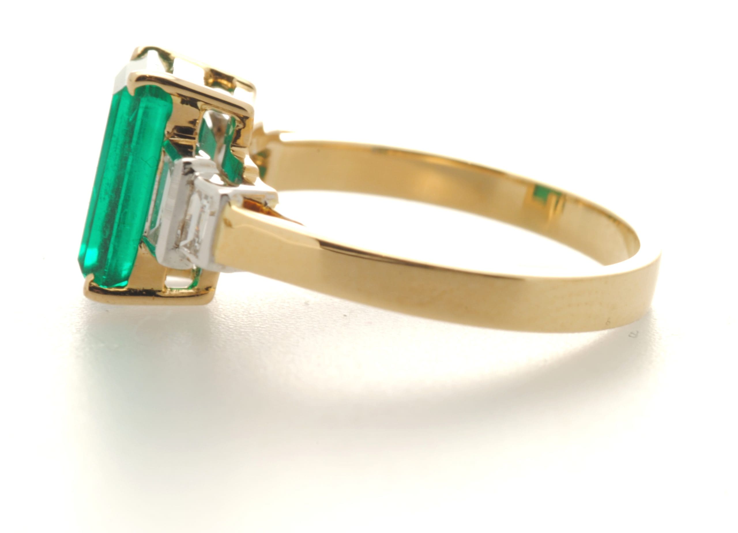 A fantastic handmade 18 carat yellow gold emerald and diamond ring, set with a central emerald of good colour and flanked with baguette cut diamonds.