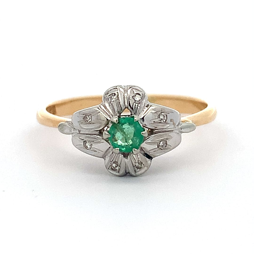 A pretty white gold diamond set flower topped with round cut emerald. On a yellow gold ring shank.
