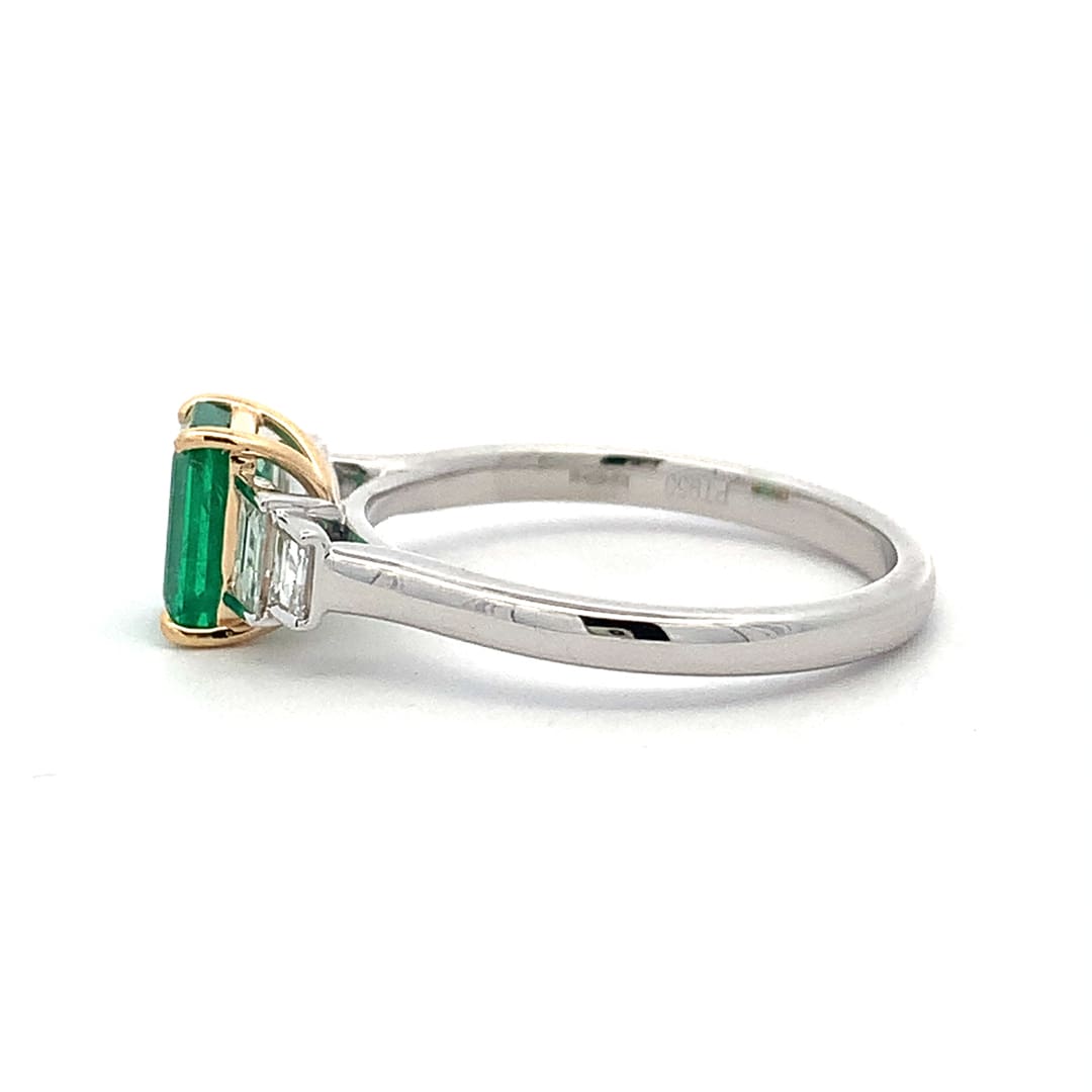 A beautiful 0.92 carat emerald claw set in yellow gold, amid tiered baguette cut diamond on a strong platinum ring.