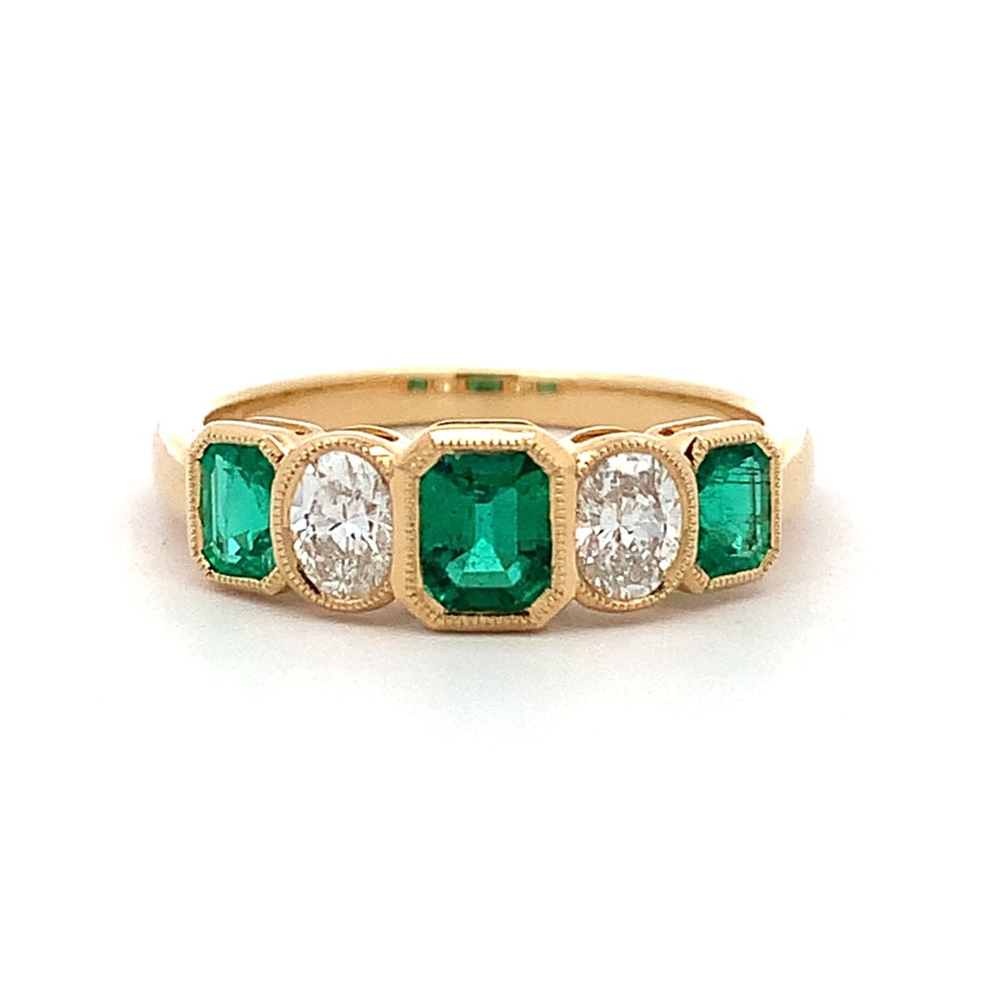 A stunning ring comprising bright emeralds and oval cut diamond. Beautifully made with milgrain edged settings.