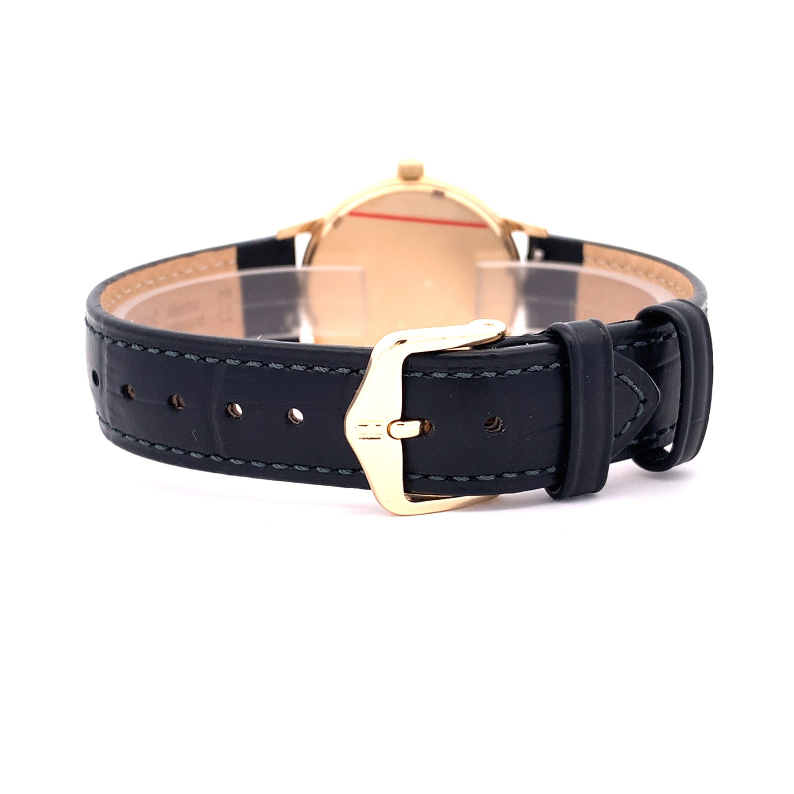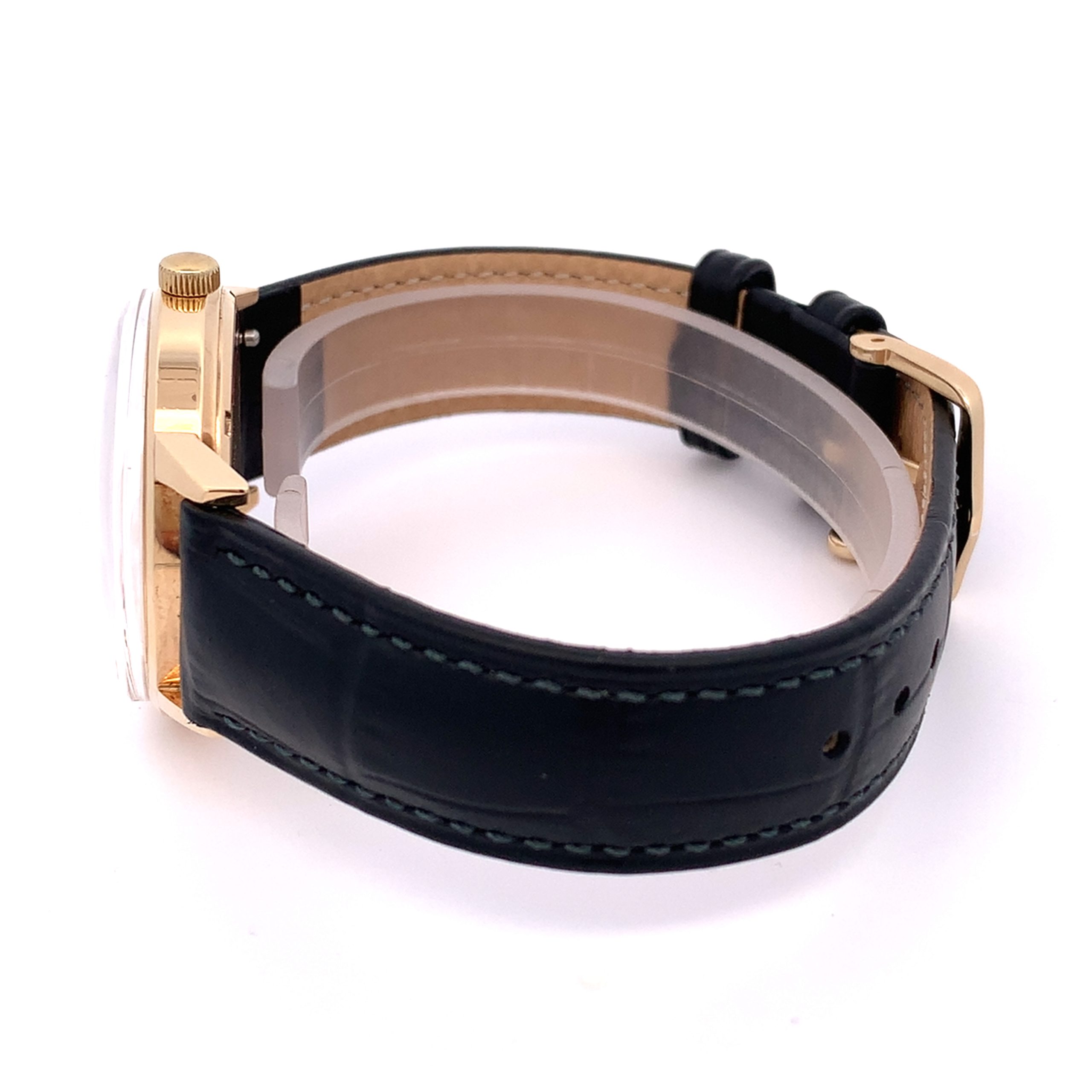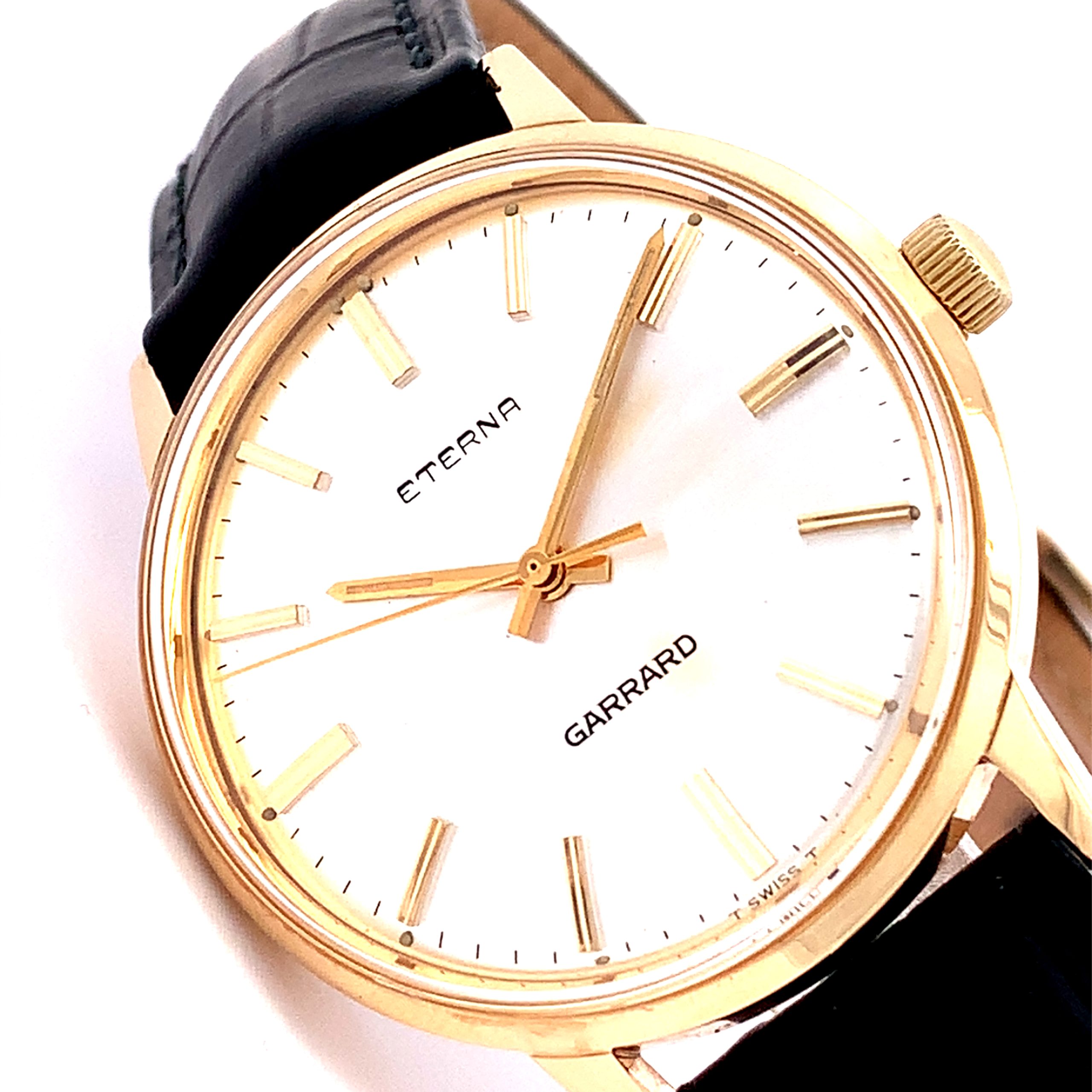 A beautiful Eterna gents watch with a solid 9 carat yellow gold case.  Fully serviced hand-wound movement.  Radial brushed silver dial with polished gold hour batons and hands.  On a black croco grain Hirsch leather strap.