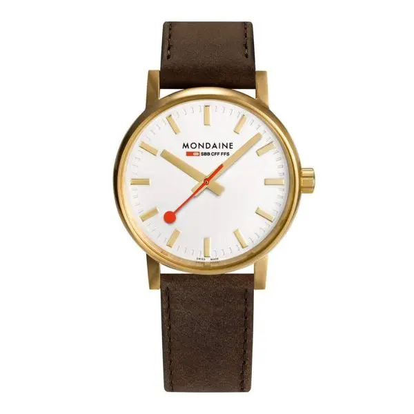 Timeless design with an elegant finish With its harmoniously designed brushed IP gold plated stainless steel case and 40 mm diameter, this Mondaine watch is a real eye-catcher and very comfortable to wear. The tone-on-tone gold coloured hands are an elegant design element. The hardened mineral crystal protects the iconic silver dial. The brown leather strap completes the minimalistic design of this watch.