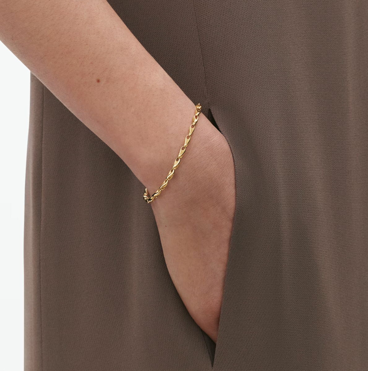 This quietly refined 18kt gold bracelet is a contemporary reimagining of classic chain jewellery, as envisioned by artist and designer Jacqueline Rabun. Its delicate gold links are crafted in a droplet-like form, stringing together in a continuous flow that wraps gracefully around the wrist.