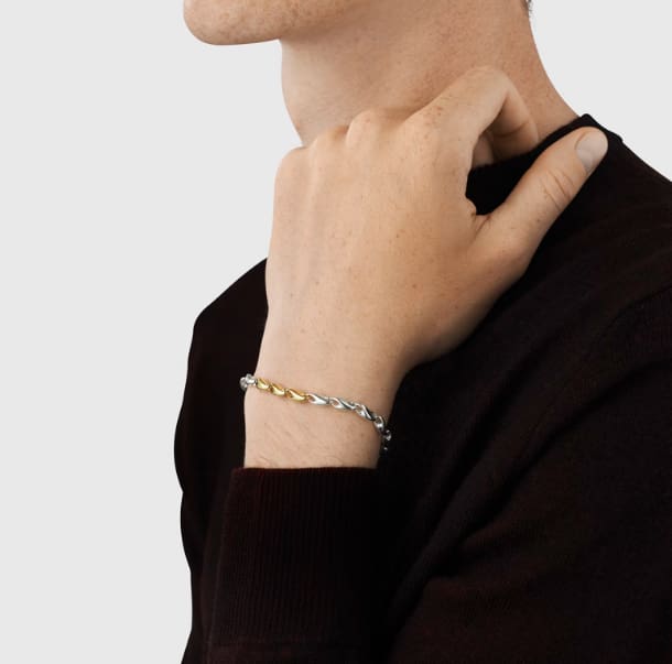 Three pieces of 18kt gold cleverly accent this bracelet, integrated into a series of links in sterling silver. Designed by Jacqueline Rabun, the bracelet combines a bold and contemporary look with Georg Jensen’s sculptural design language. Fasten it by using its integrated clasp.