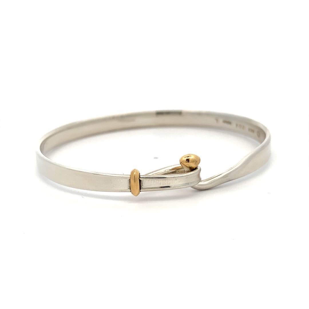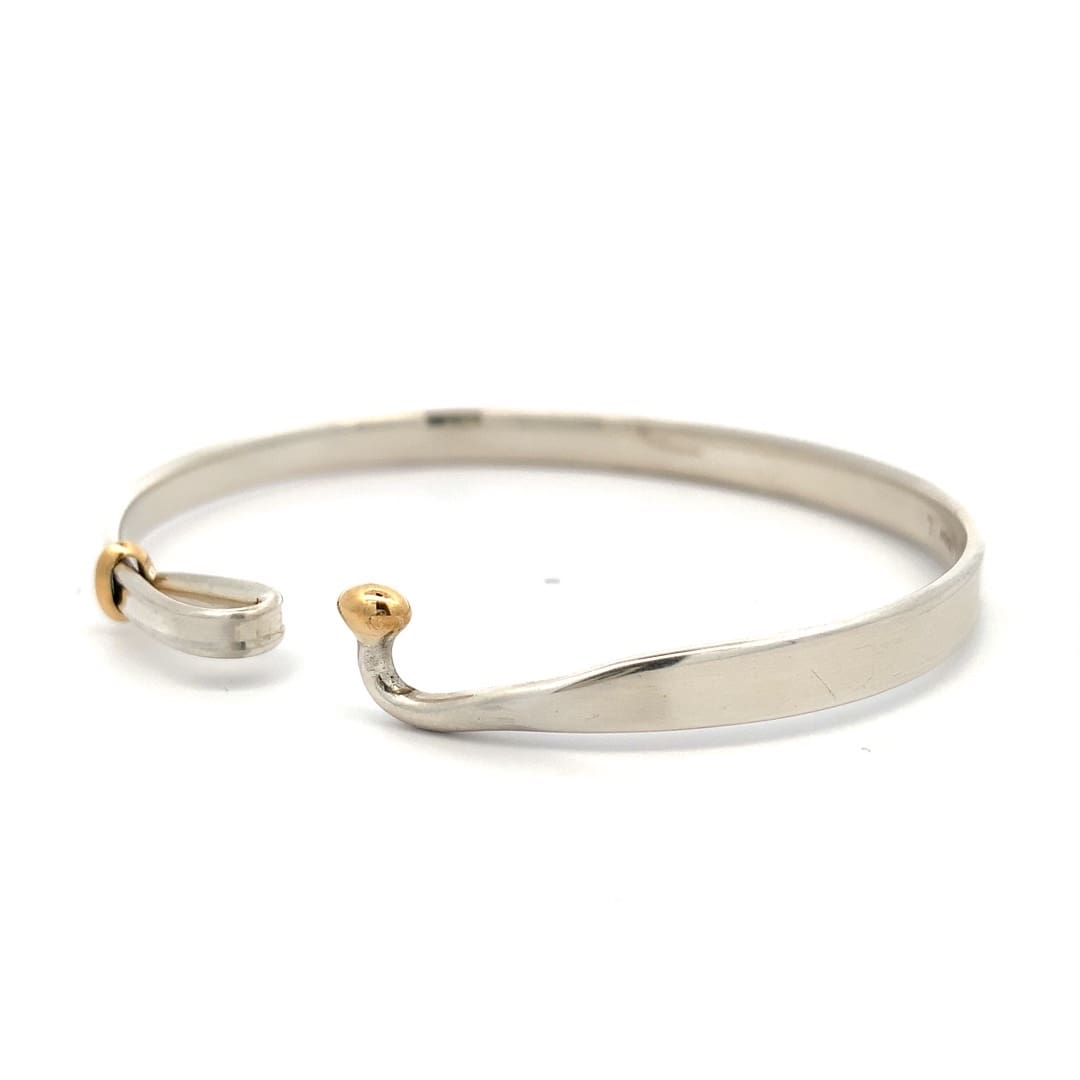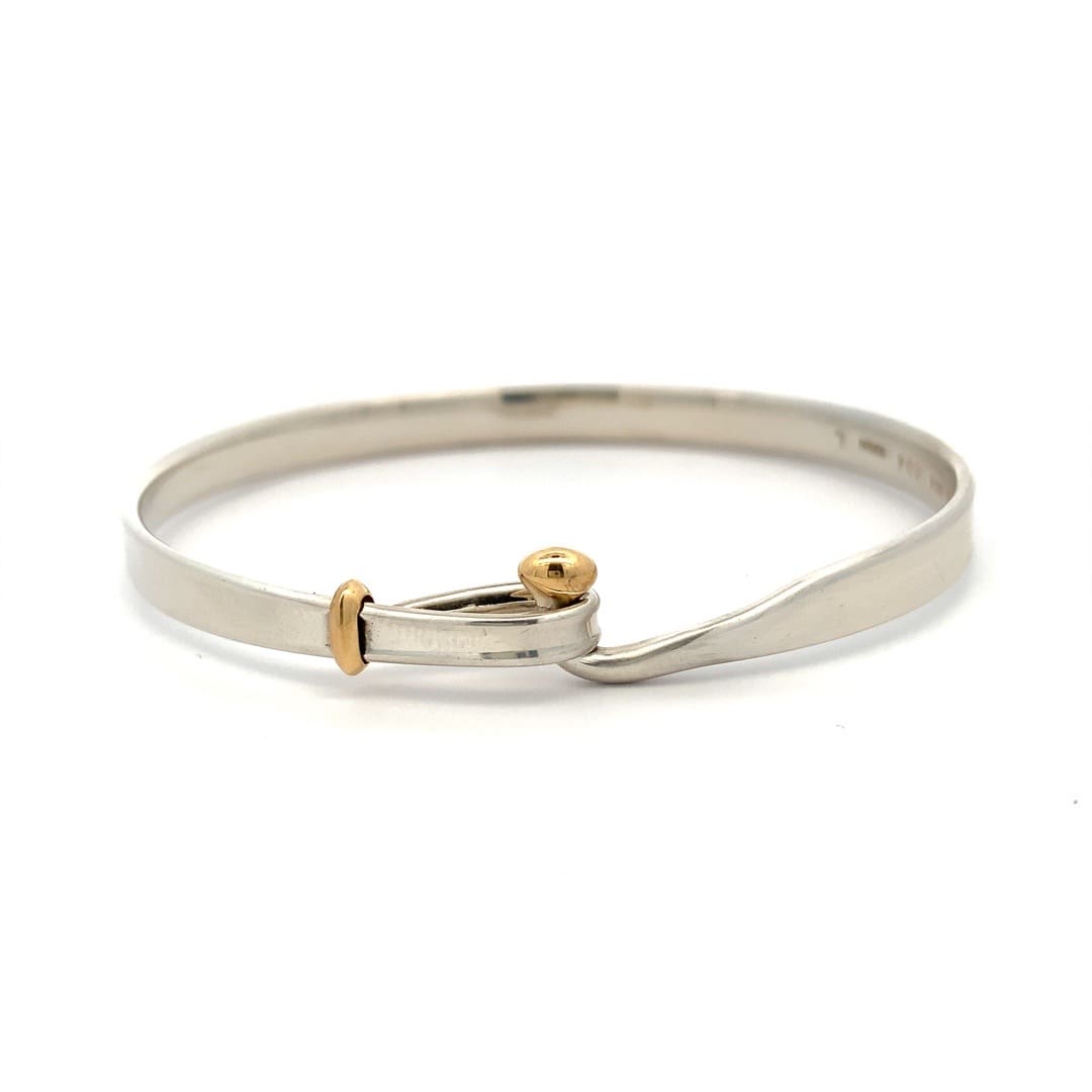 A beautiful bangle design by Georg Jensen in sterling silver and 18ct yellow gold. The bangle opens a little when released to allow it to slip over the hand.