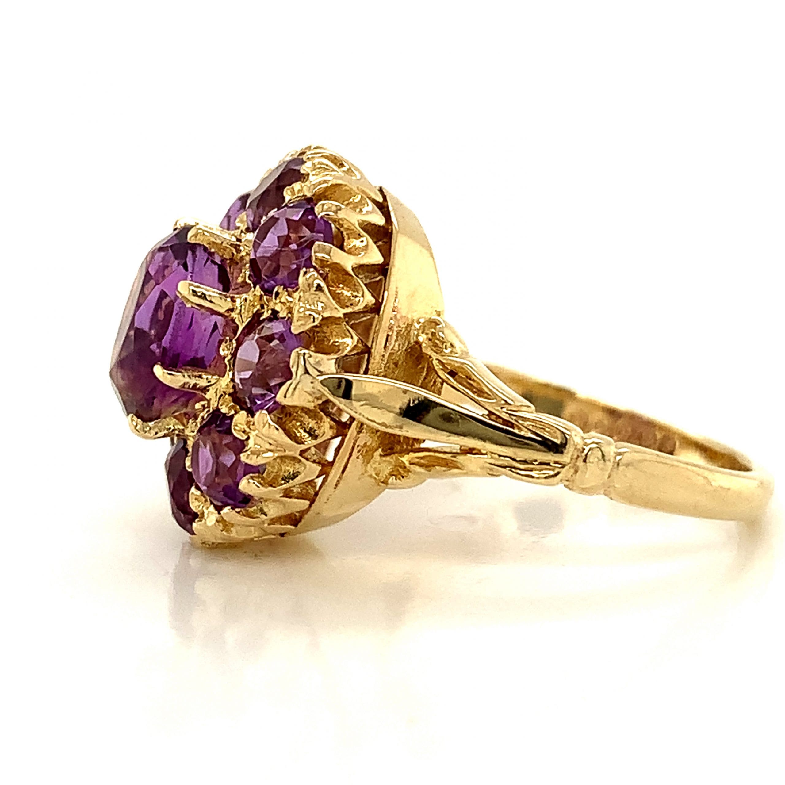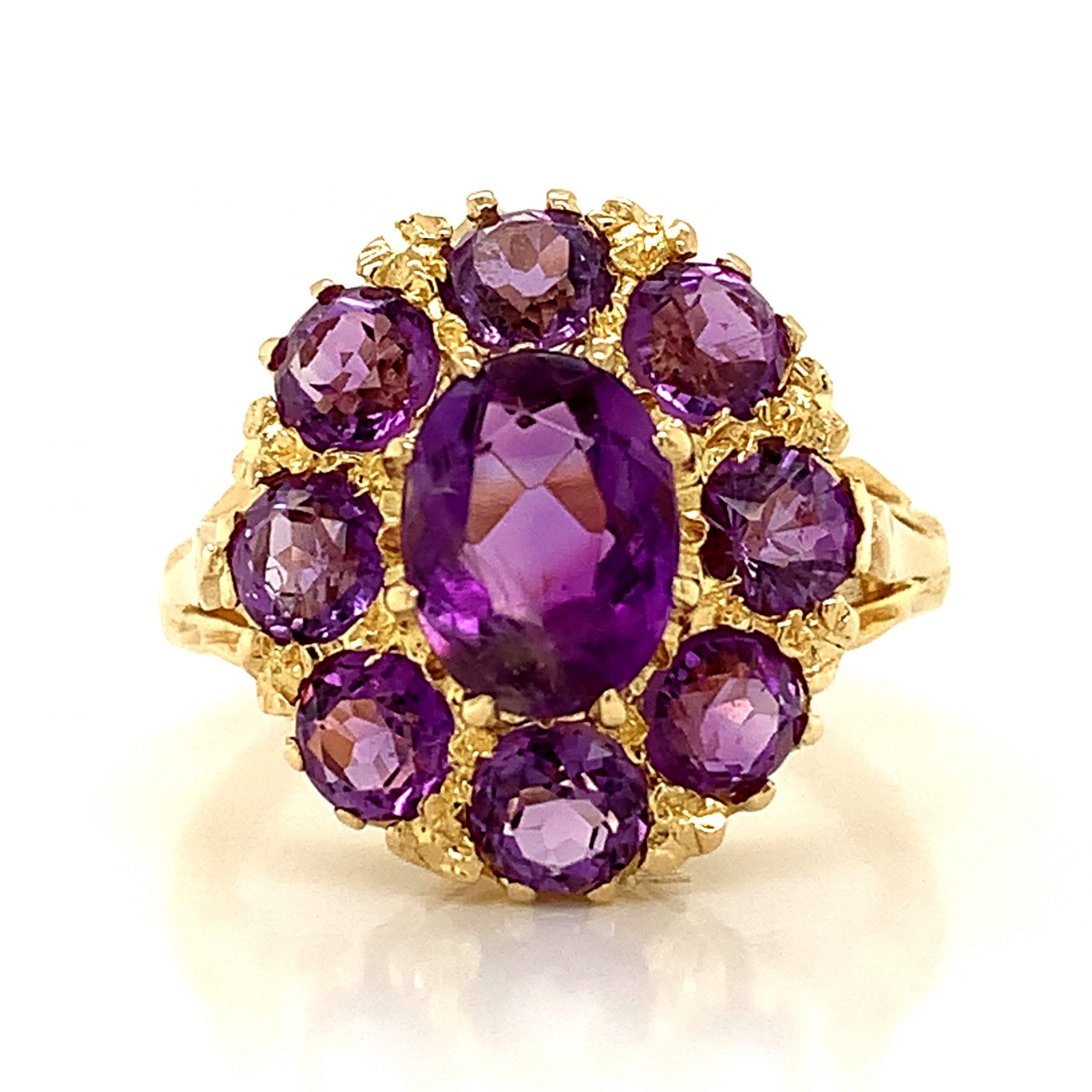 A tall cluster style ring in yellow gold with a central oval faceted amethyst an eight claw setting above a ring of grain set round faceted amethysts. Made with a fancy split ring shank.