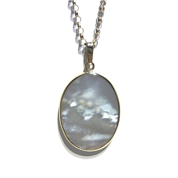 This attractive large double-sided pendant has white Mother-of-Pearl on one side and a banded colourful version on the other. On a 24 inch Belcher chain.Metal: 9 Carat Yellow GoldDate: ModernPendant Width: 31 mmChain Link Width: 3 mmChain Length: 24 InchesClasp: Bolt RingAs a pre owned item, this necklace has been examined and professionally cleaned and polished in our workshop.Gift Boxed