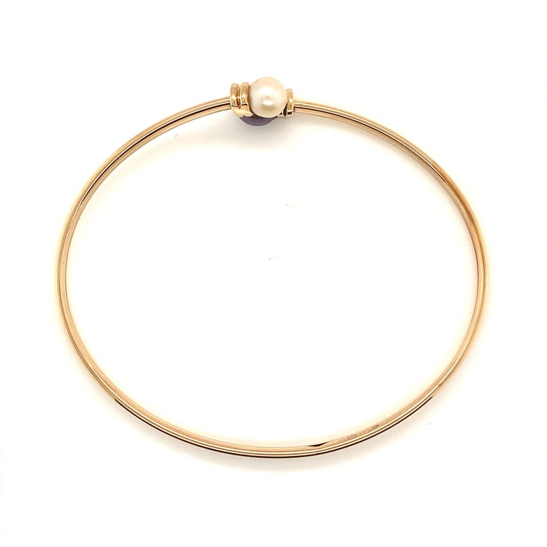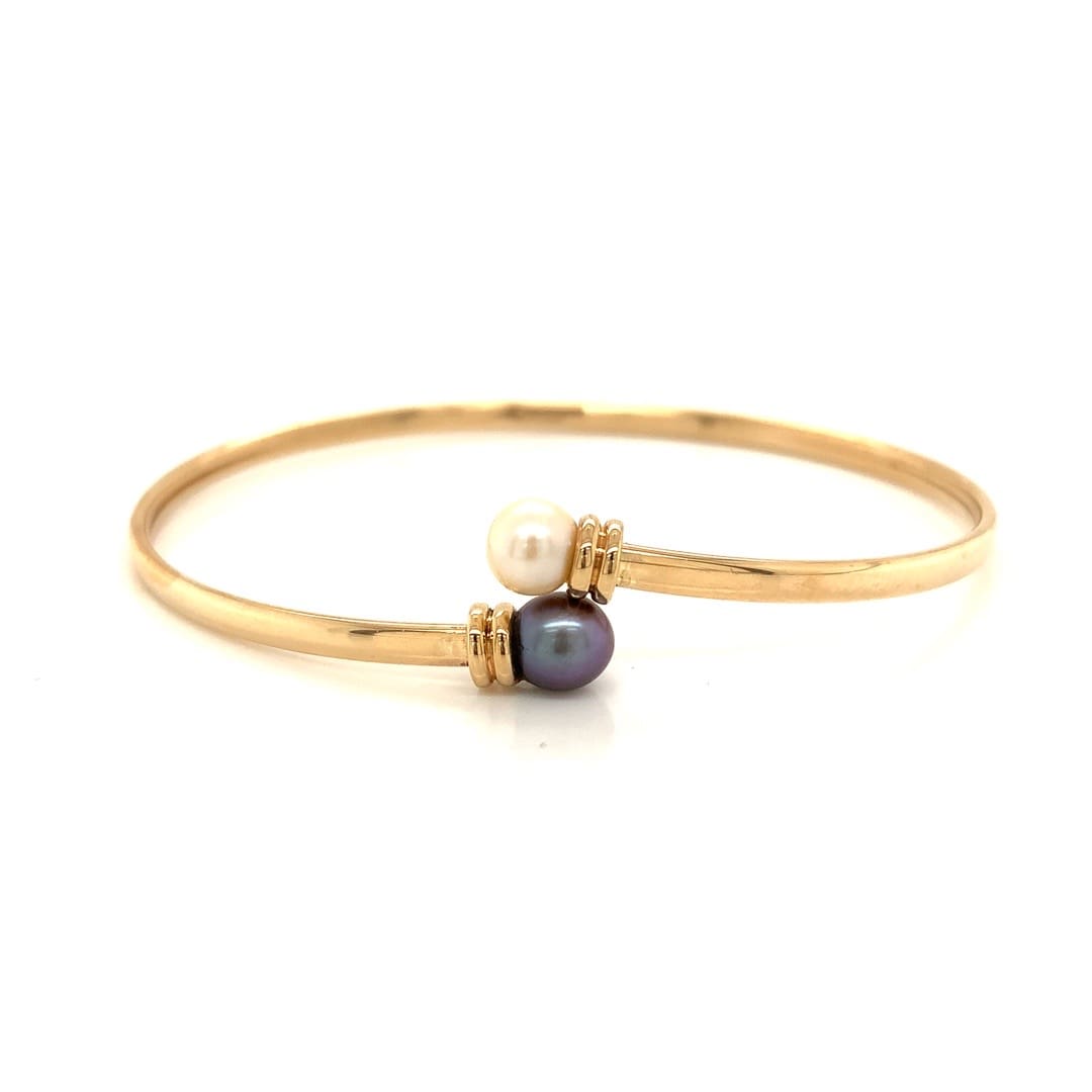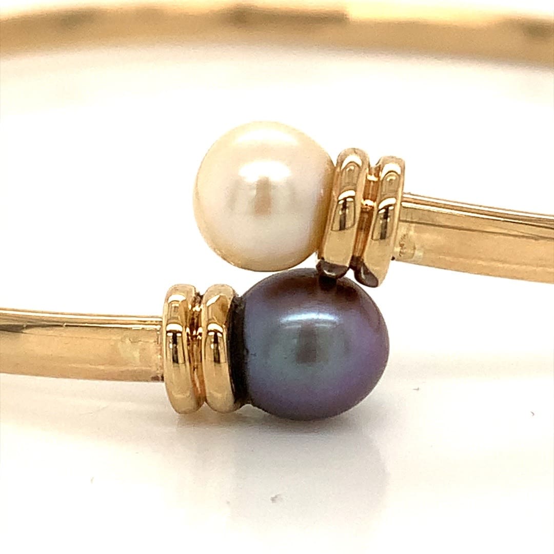 A pretty yellow gold flexible bangle set with white and peacock freshwater pearls.