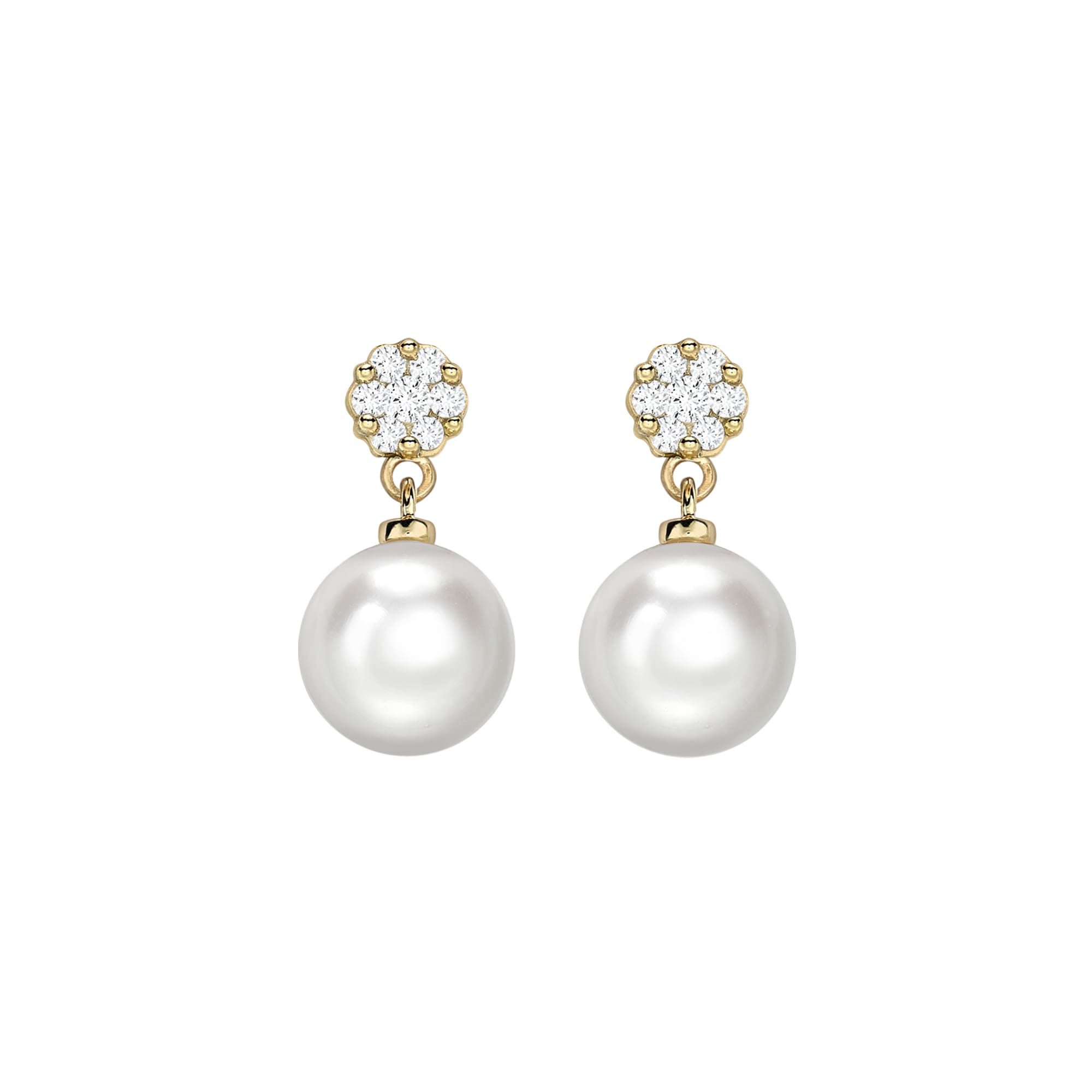 Convertible classic earrings with removeable high lustre white cultured pearls suspended on yellow gold diamond cluster studs.