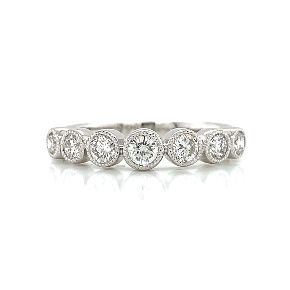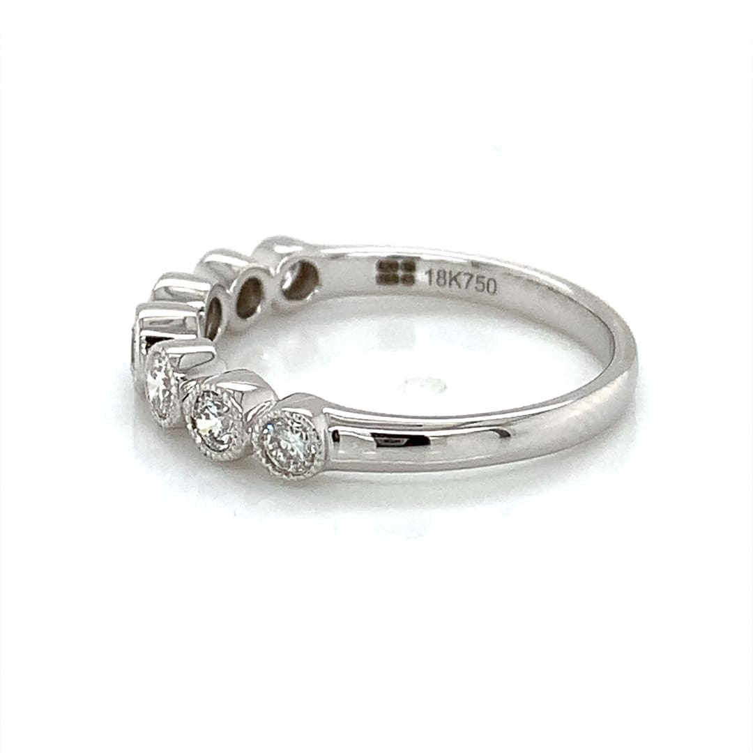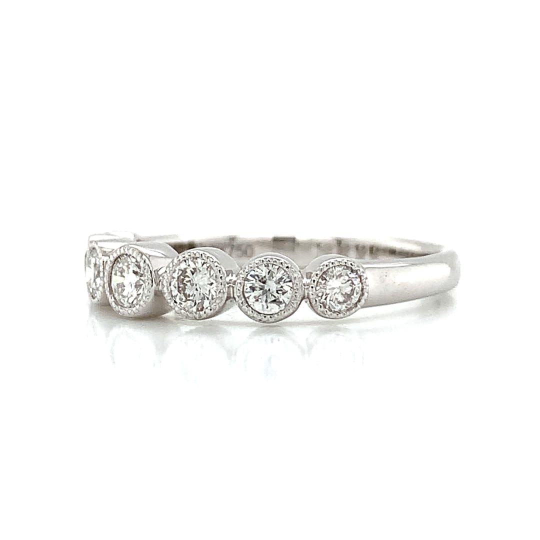 A pretty row of graduating round brilliant cut diamonds with good colour and clarity – all set within mill-grain rub-over settings on a strong ring shank.