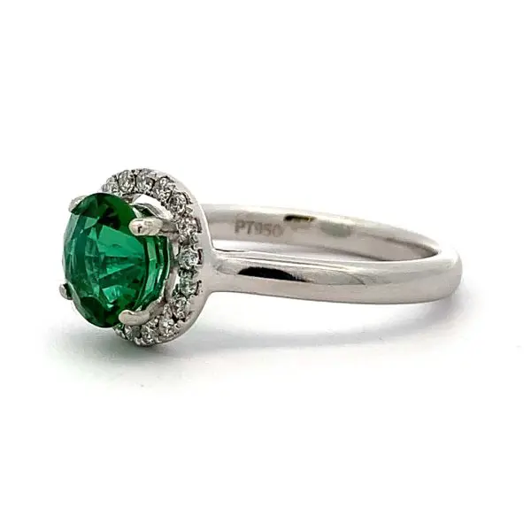 A lovely Platinum ring with a raised claw set natural green Tourmaline complemented by a bright Halo of round cut Diamonds. This ring is designed to allow a wedding band to sit neatly under the setting. This is a certificated untreated natural Tourmaline.