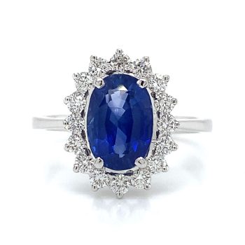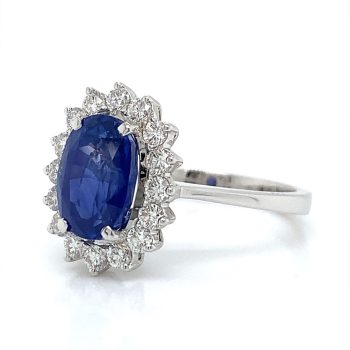A low set, oval cut Blue Sapphire surrounded by brilliant cut Diamonds, all in a millegrain edged rub over setting. Each shoulder is pave set with three round cut Diamonds. This ring is a one-off handmade piece.