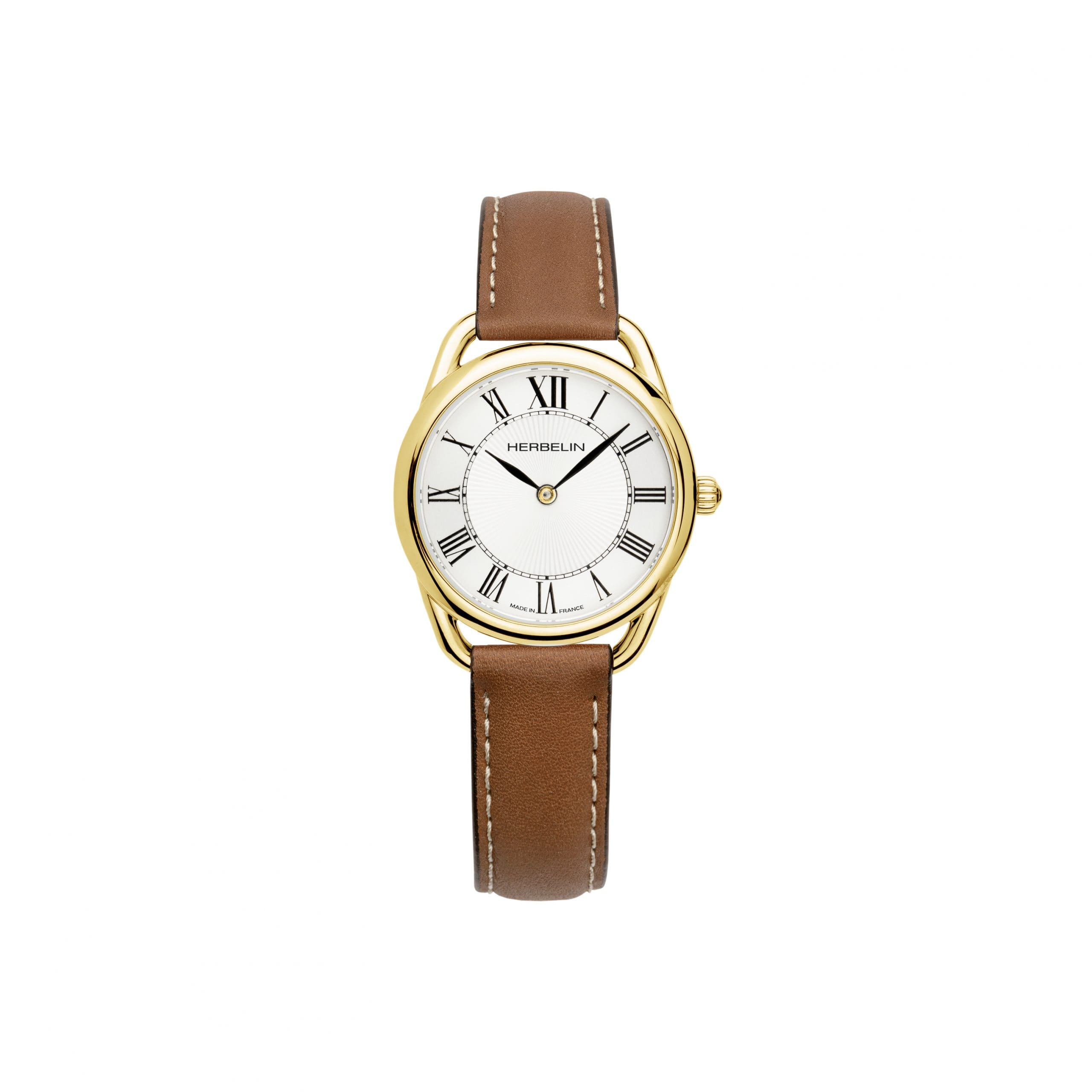 Curved lines and a touch of modernism for this Equinox collection that is both urban and classic. This Herbelin watch has a dial with Roman numerals and a PVD gold plated steel case. Mounted on a gold leather strap, this watch ensures a chic and classic look.