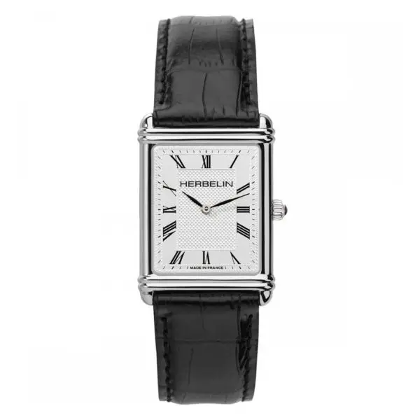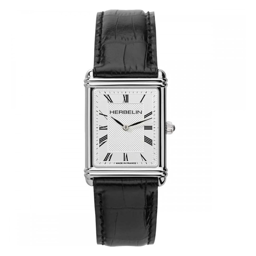 The white silver dial with Roman numerals is embellished by the Clous de Paris guilloché. The black crocodile leather strap gives a modern touch to this model. This watch has a minimalist and refined design.