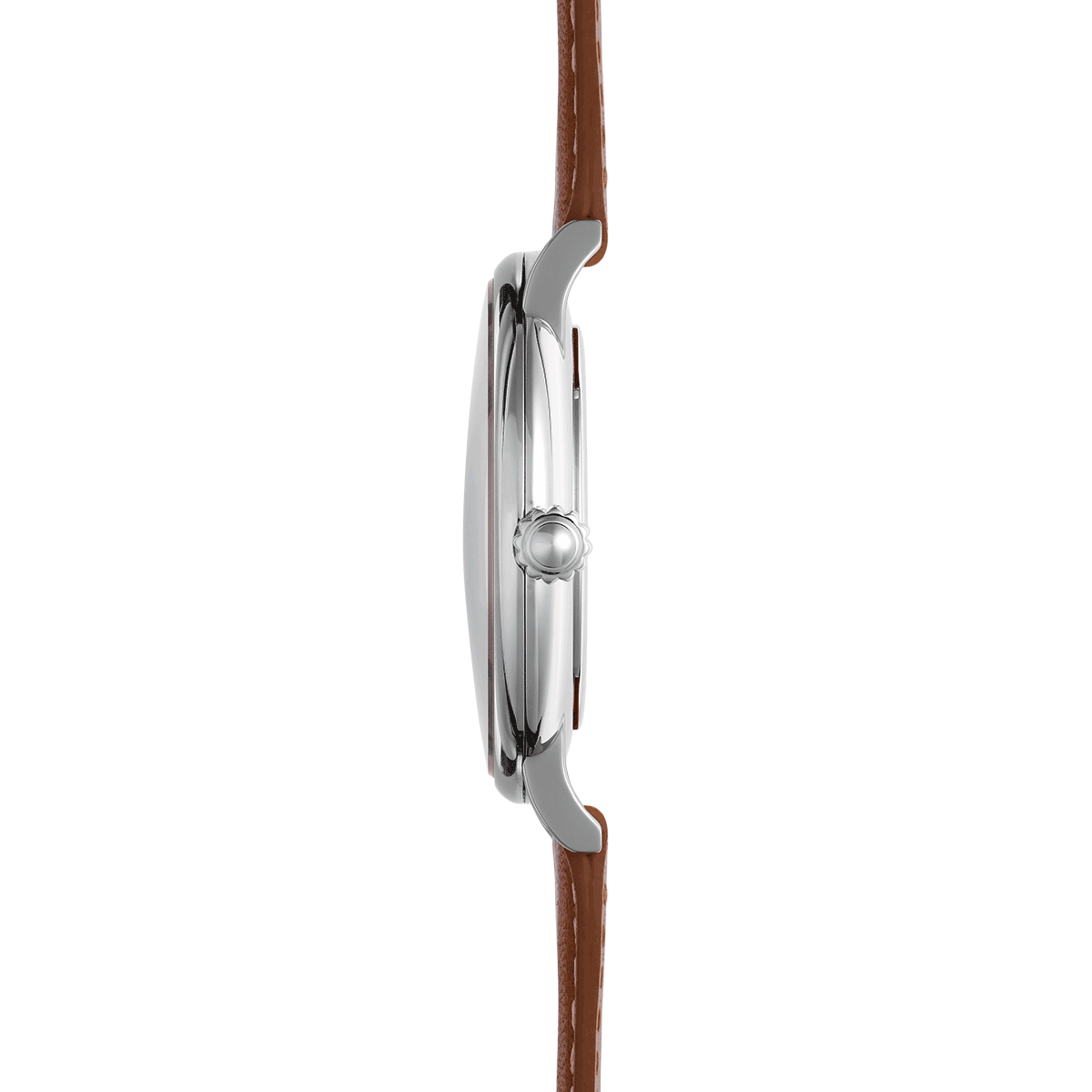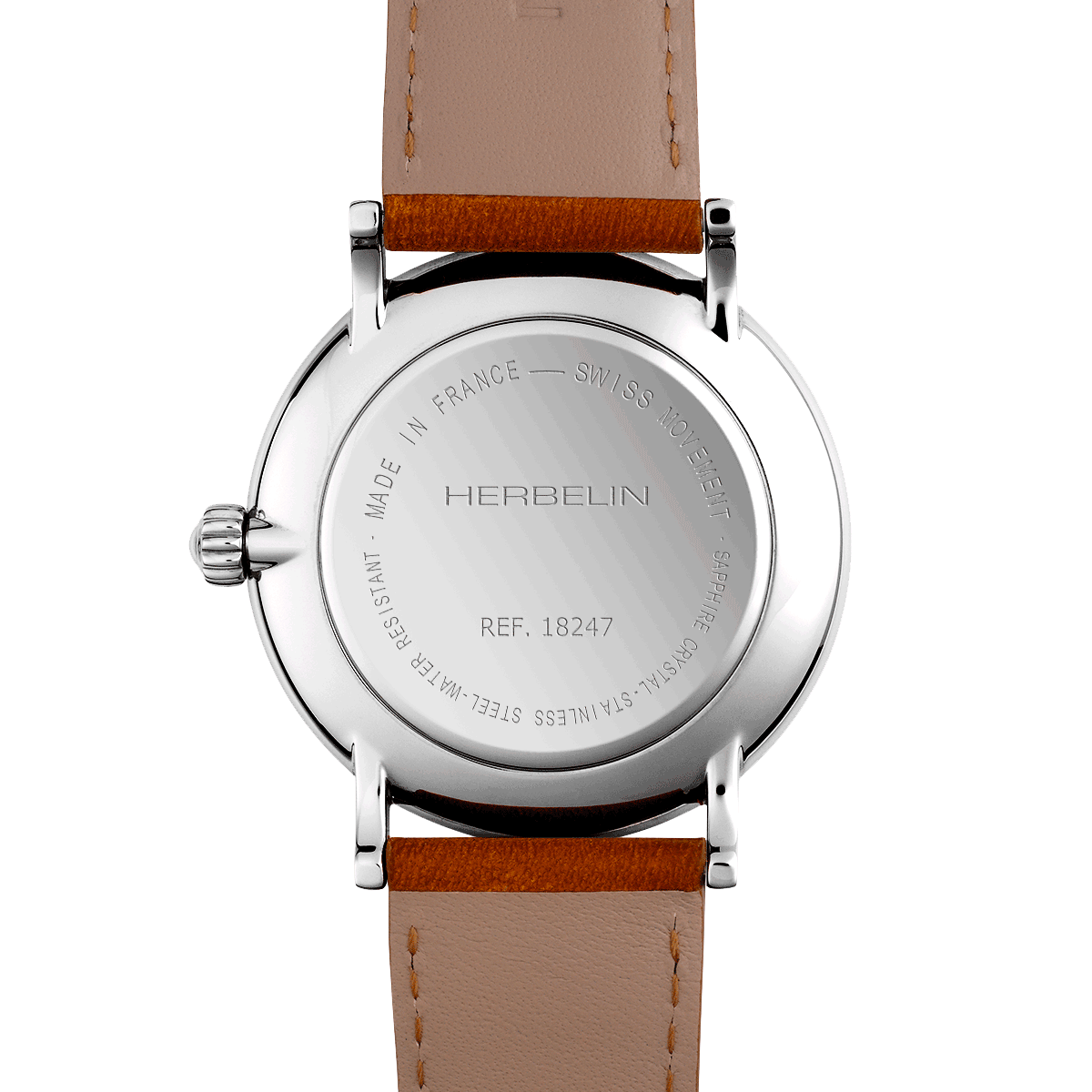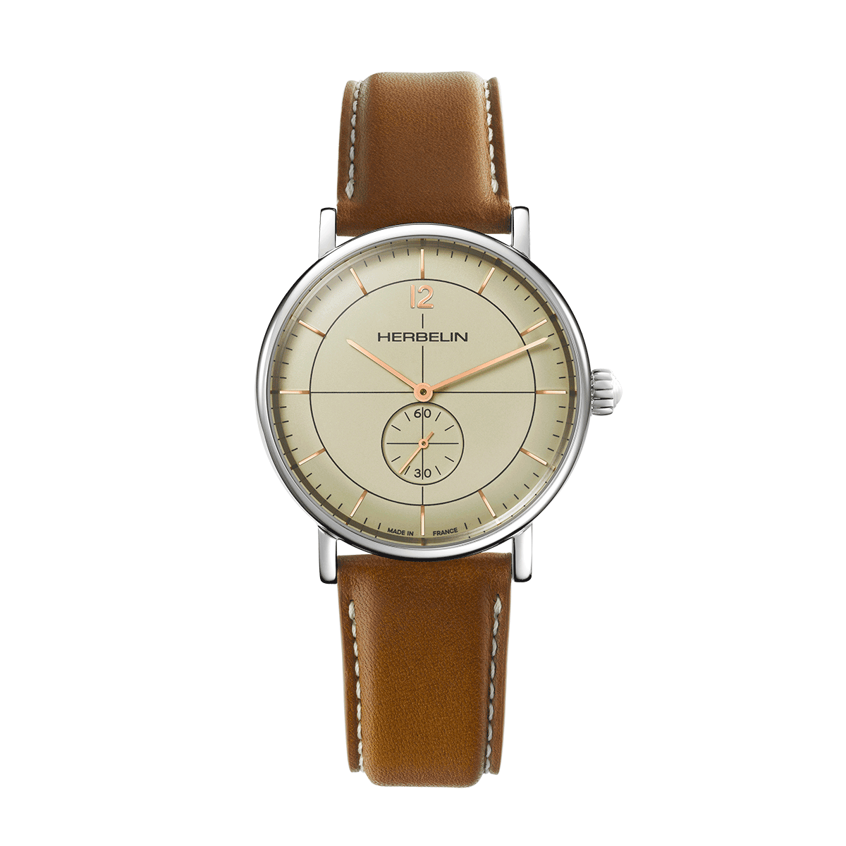 Inspiration is a collection inspired by the 50s. The dial is completed with circles and graphic lines, as well as indexes in yellow gold PVD. The gold leather strap brings modernity and elegance.