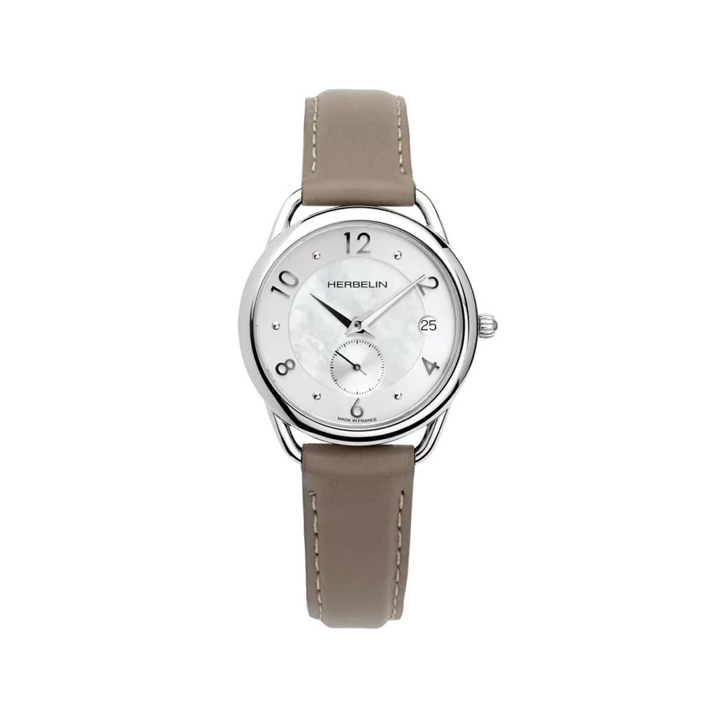 Curved lines and a touch of modernism for this Equinoxe collection that is both urban and classic. With a genuine mother-of-pearl dial decorated with Arabic numerals and a leather strap, this Herbelin watch accompanies women’s wrists with distinction.