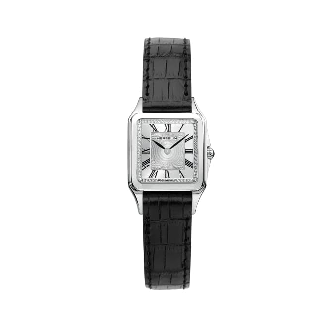 The brushed silver guilloche dial is complemented by Roman numeral markers that perfectly match the stainless steel case. The black leather strap gives an elegant touch to this Luna model.