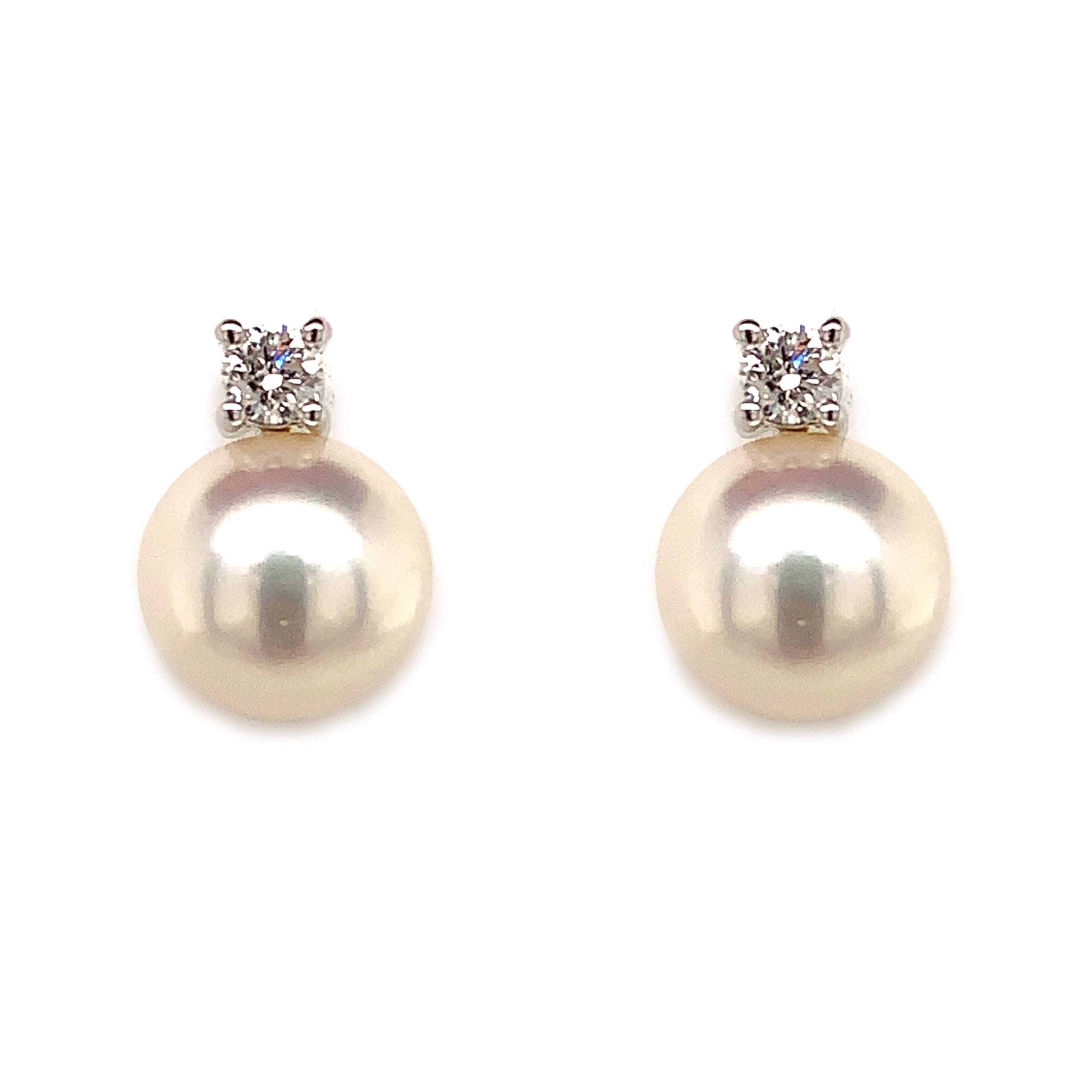 Classic white Gold stud earrings with high lustre round Pearls and claw set bright brilliant cut Diamonds.