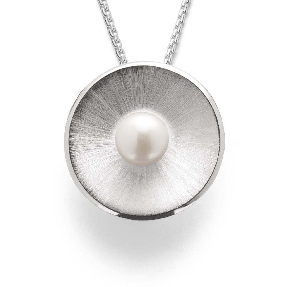 Rhodium-plated sterling silver forms into a round pendant with a satin matt surface and polished rim. The middle arranged cultured white freshwater pearl is the highlight of this pendant which is actually kept rather simple. A timeless elegant jewellery piece designed by Nadine Resch.