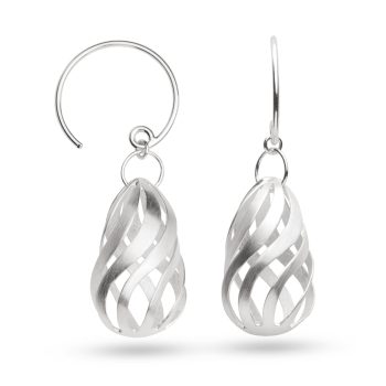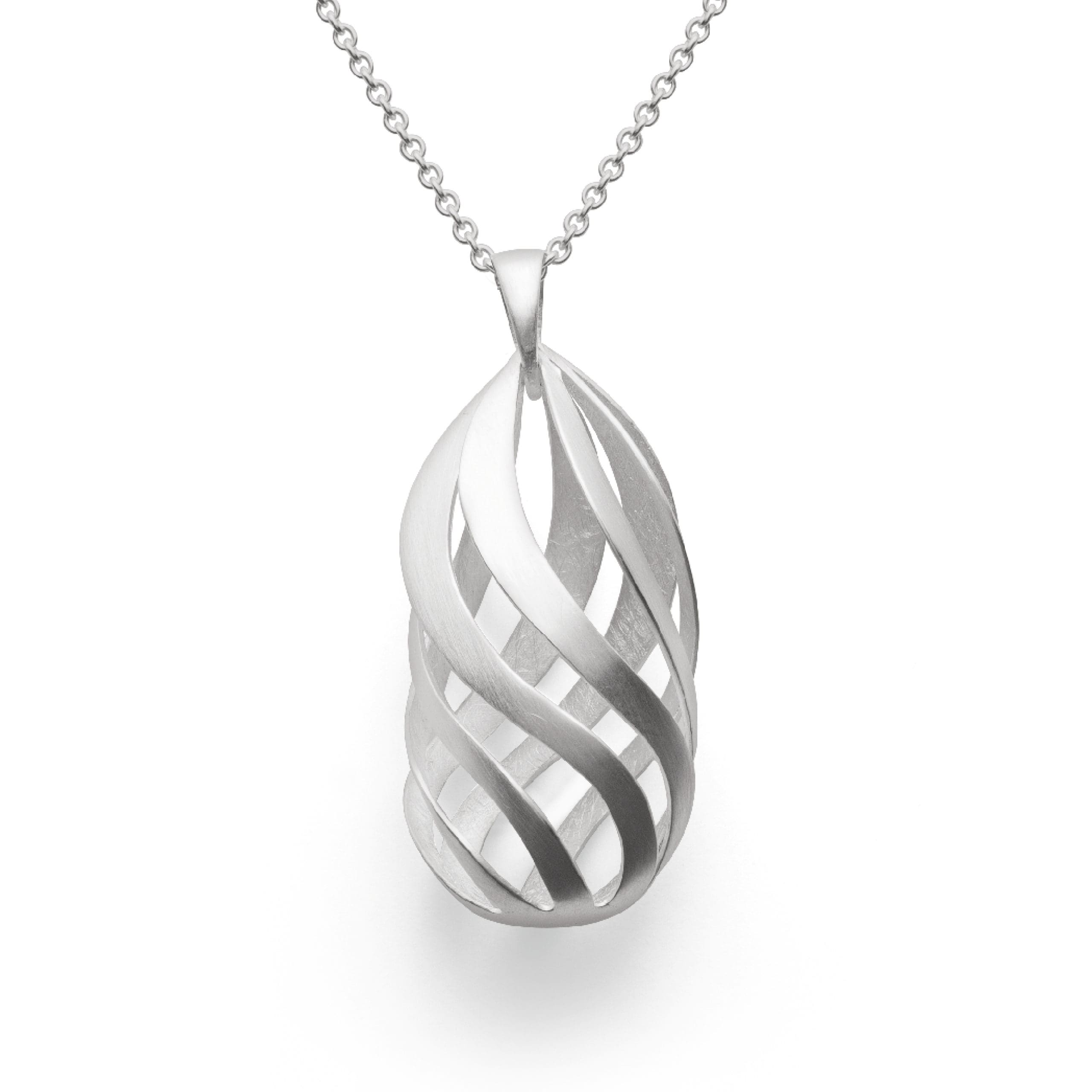 Satin matted sterling silver made into a dynamic formed pendant designed by Arek Wolski. This pendant can be worn with a short or a longer necklace. Matching earrings available.