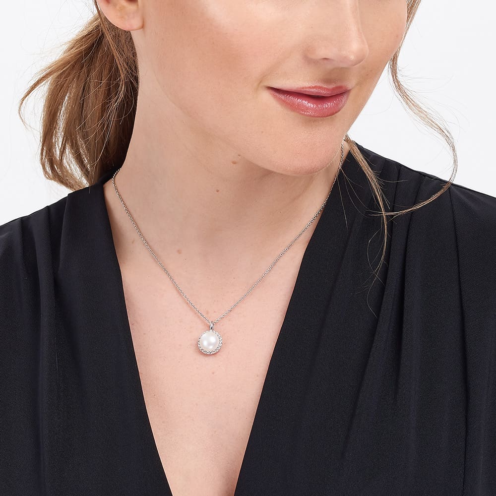 The indulgent pendant of pavé set stones shines light to play across the surface of our pristine Freshwater pearl.