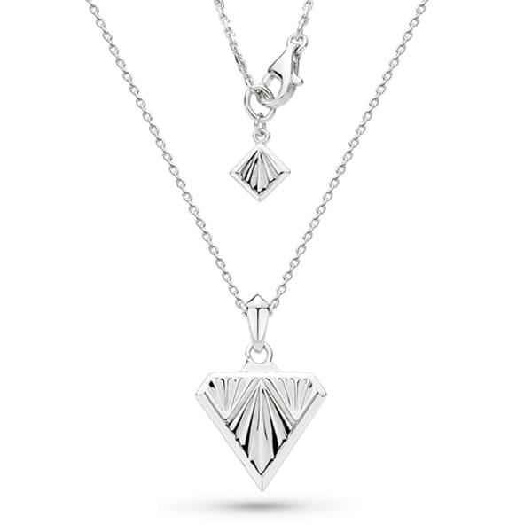 Poignant to say the least, the contrasting angles of the sunburst design on this triangular diamond shaped necklace is reversible for a fully polished, engravable side.