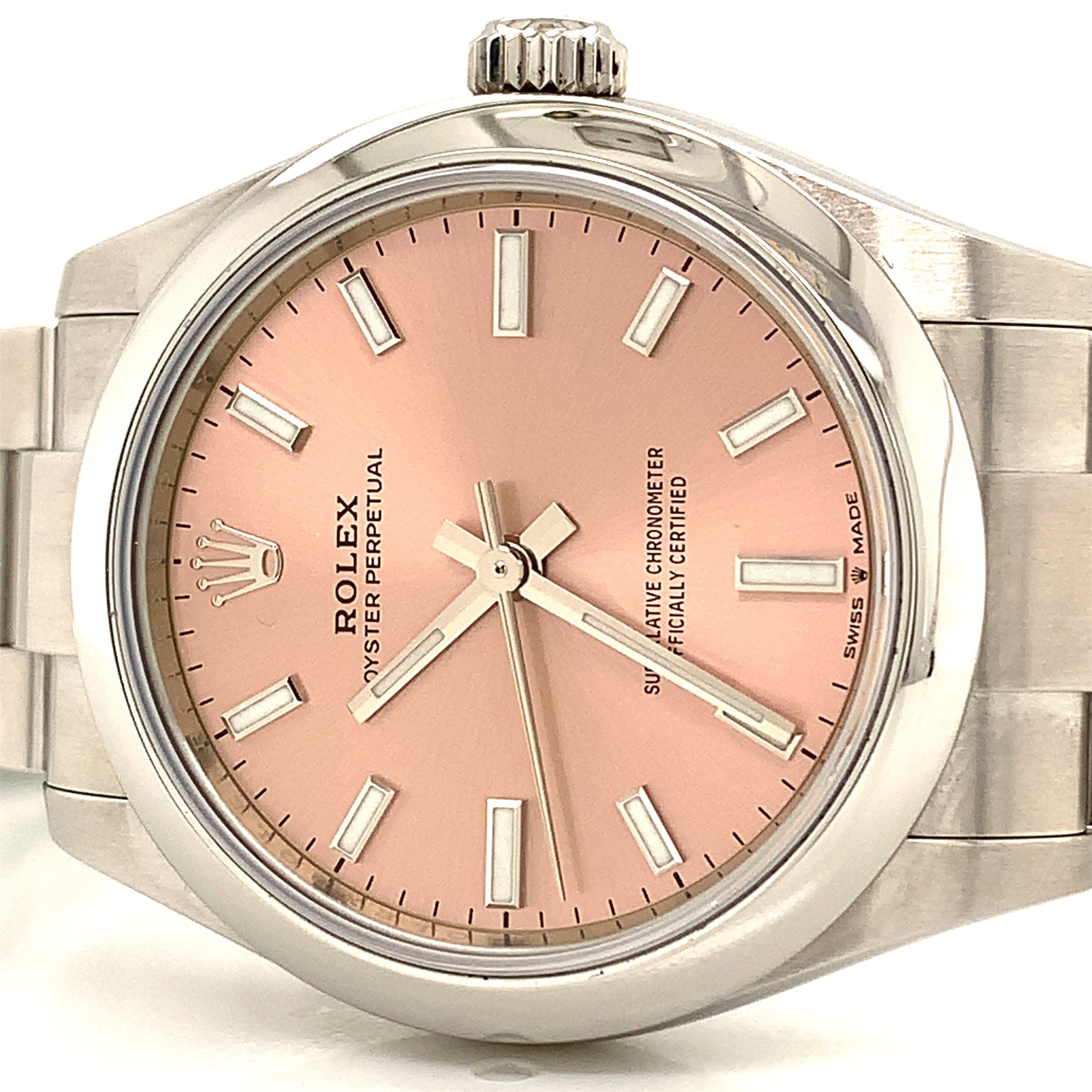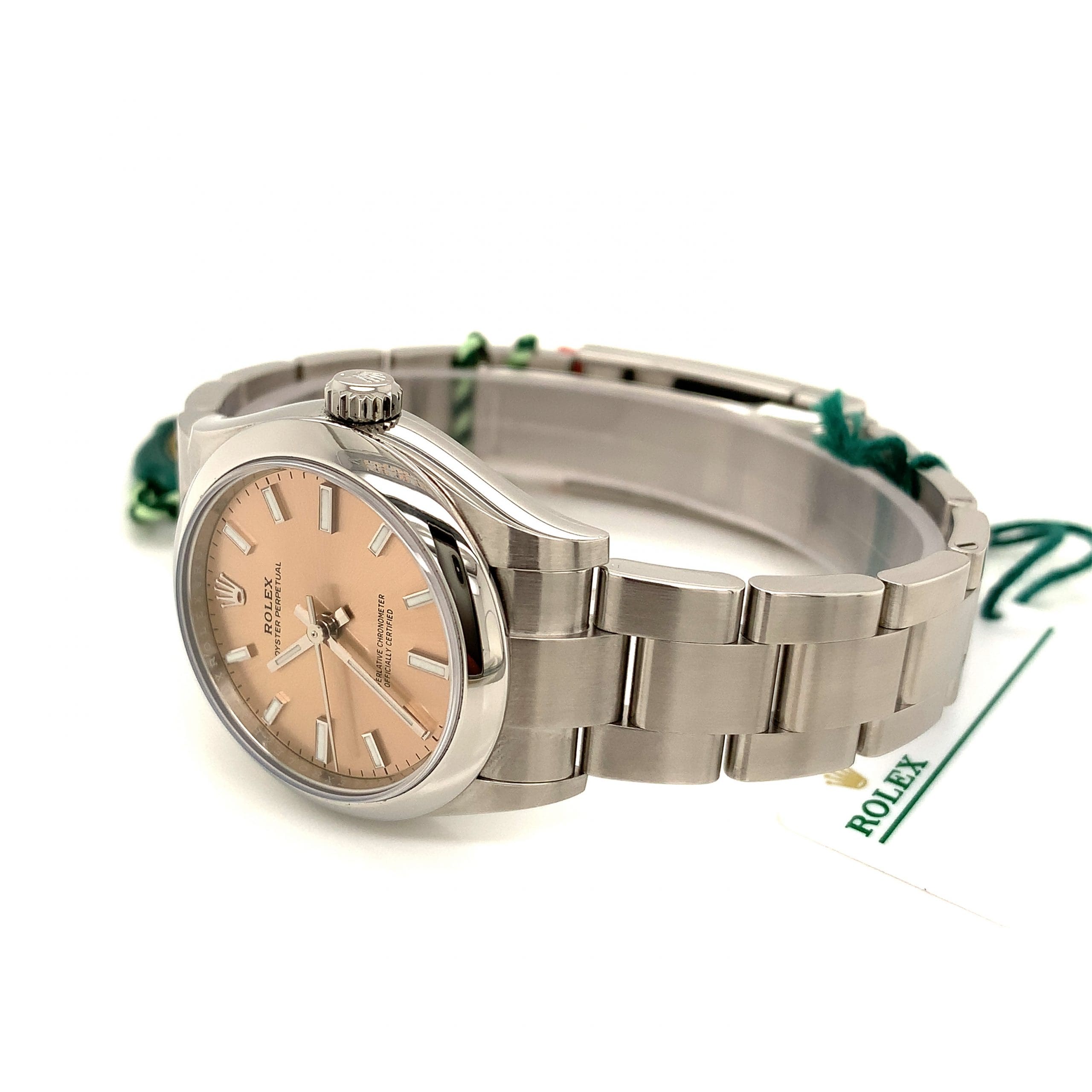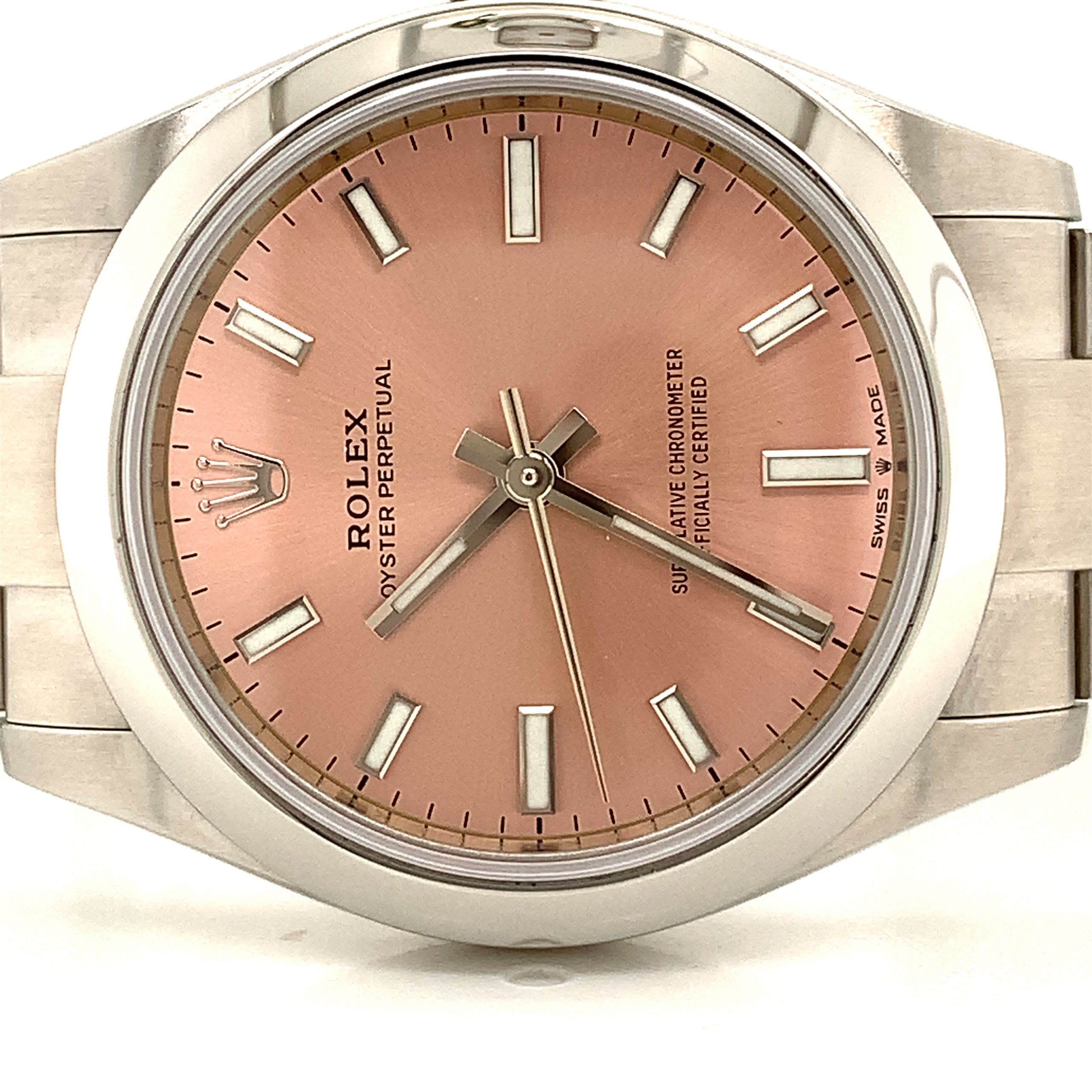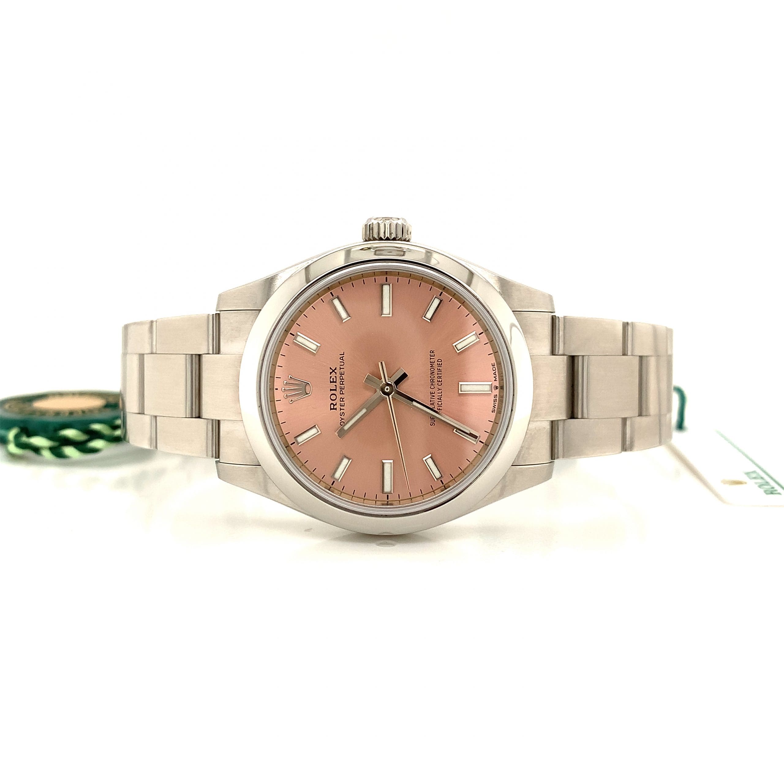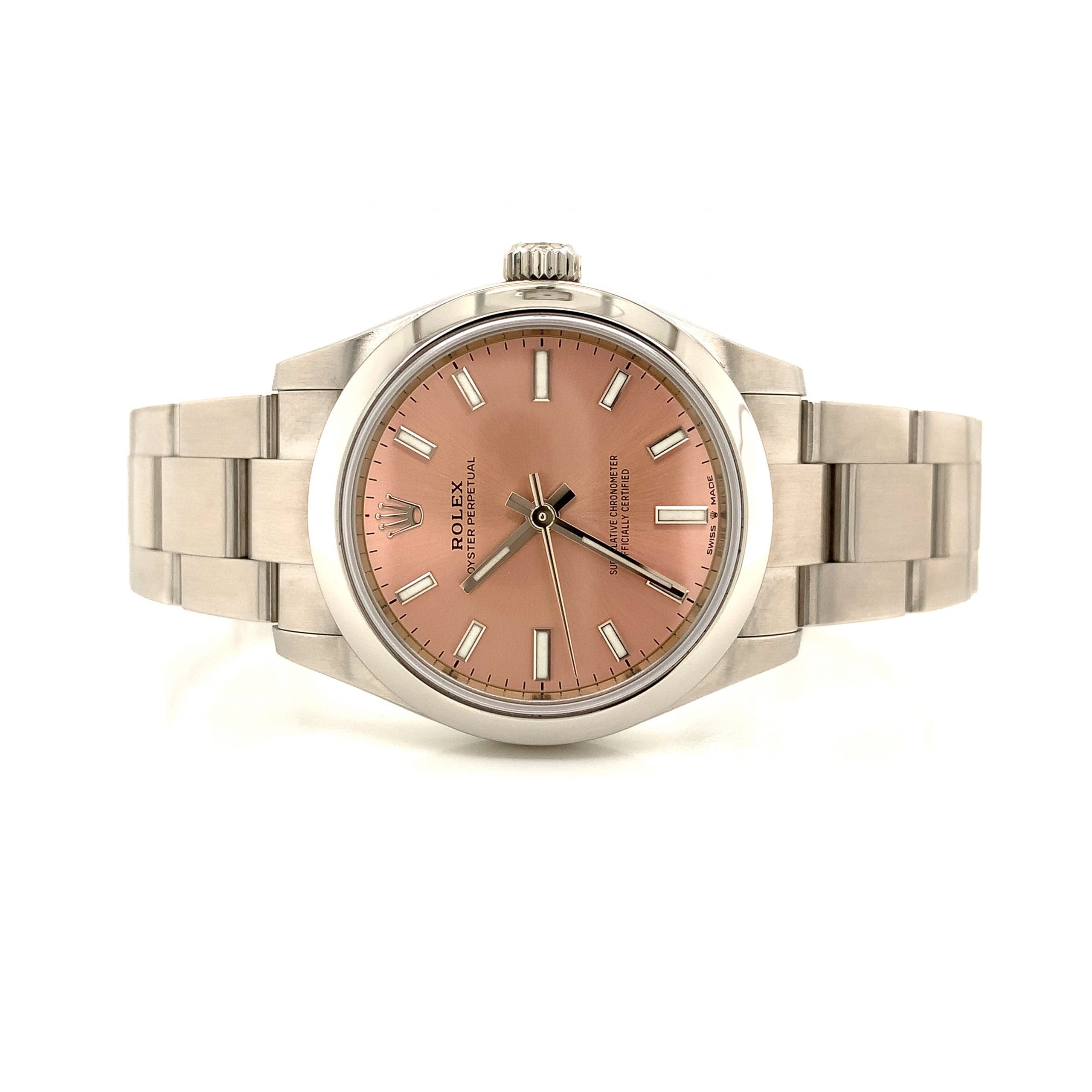 This is a ladies Rolex Oyster Perpetual automatic watch. With Rolex Oyster stainless steel case and bracelet. Soft pink sunray dial with luminous batons and hands. In original box and complete with tags and papers.