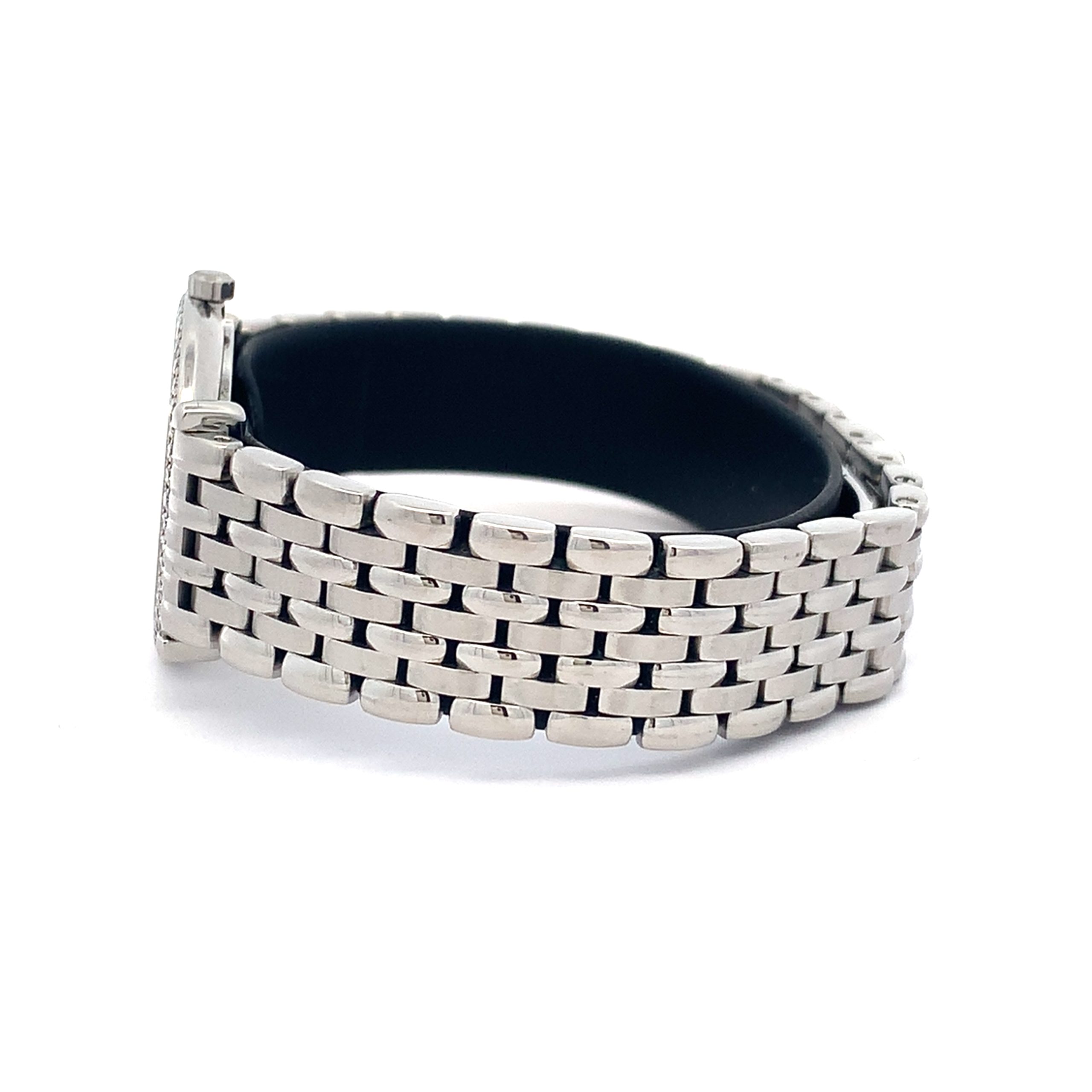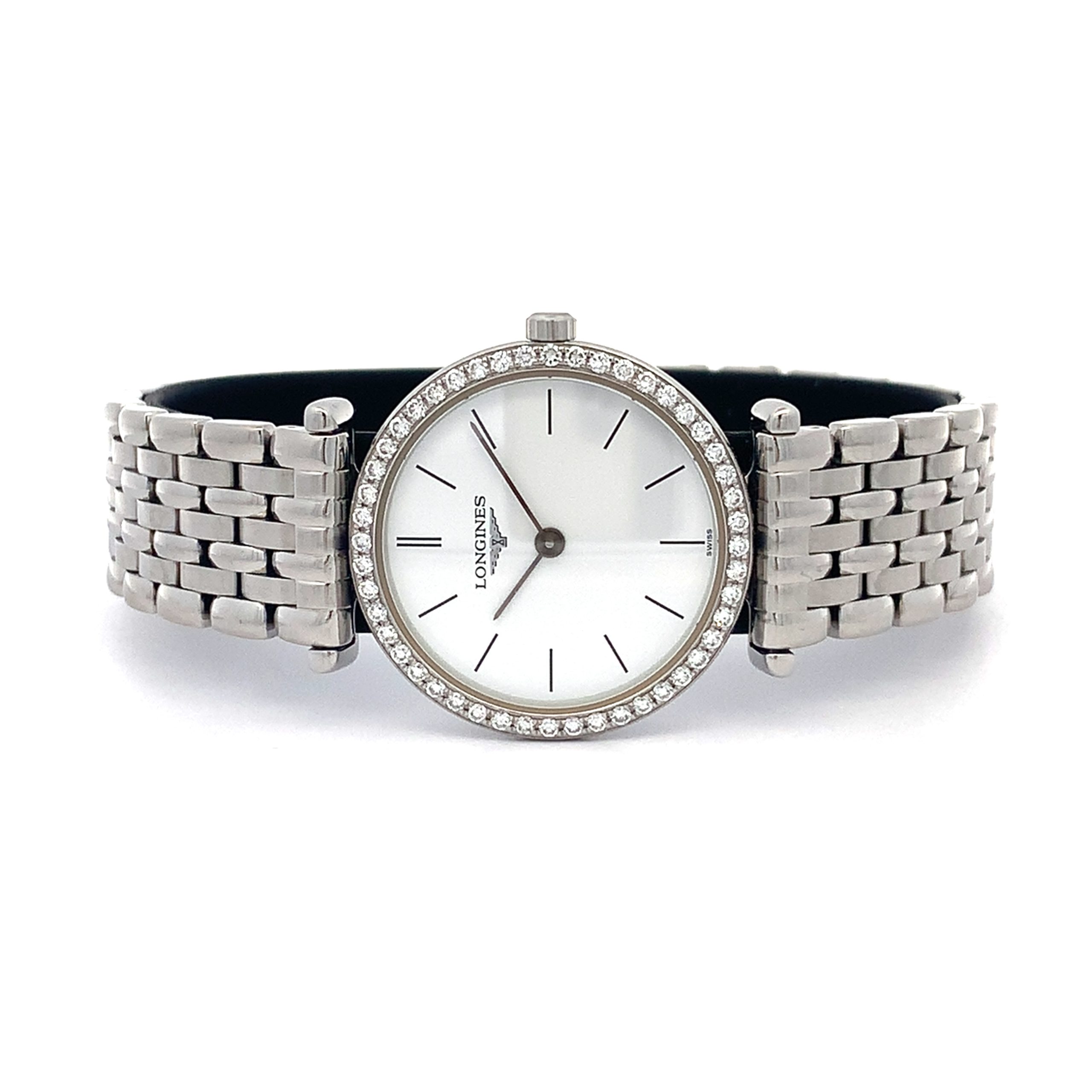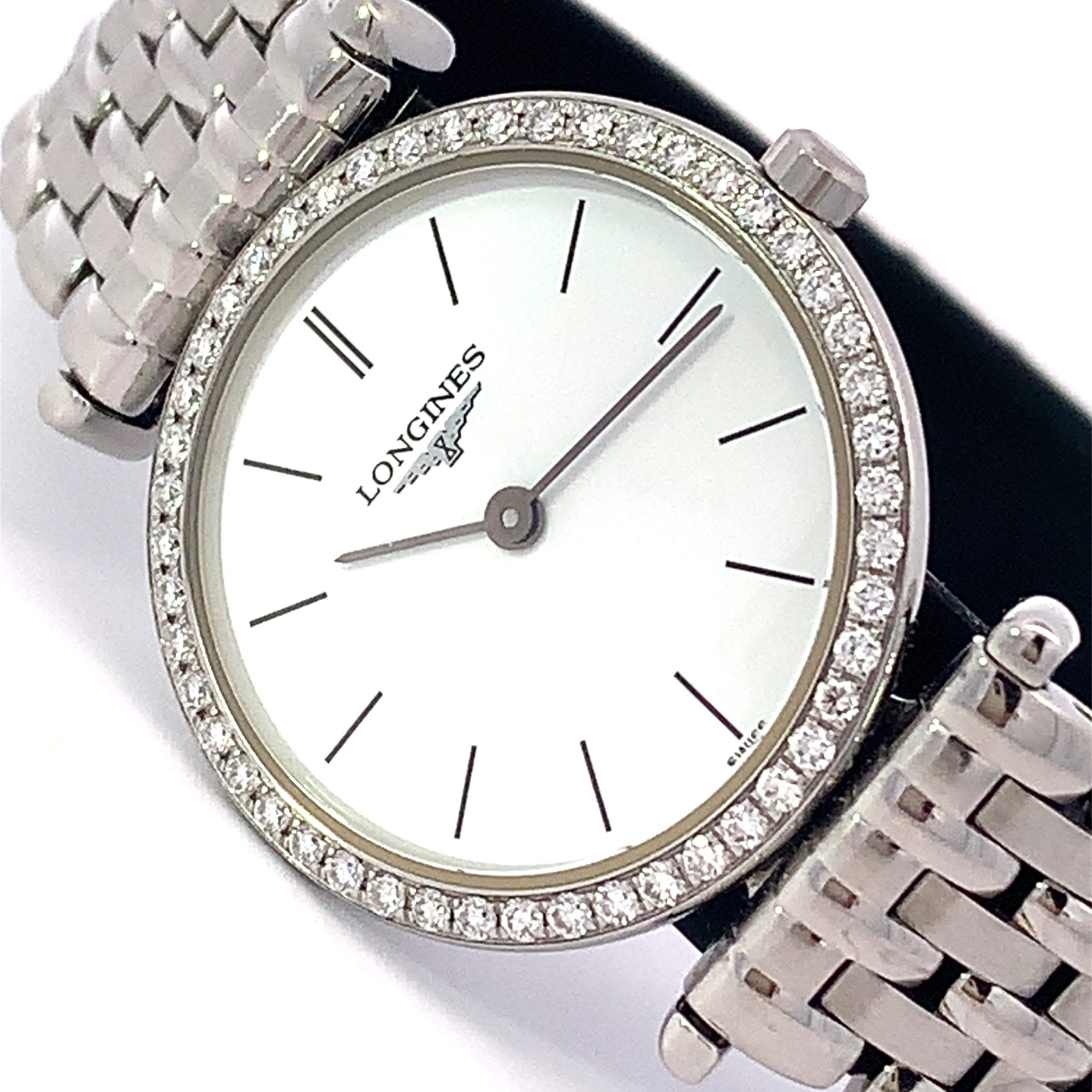 An elegant pre-owned ladies stainless steel La Grande Classique watch with a diamond set bezel.  White dial and fine black hour markers and hands.  The smooth bracelet has a push-close bi-fold clasp.  Very good condition.