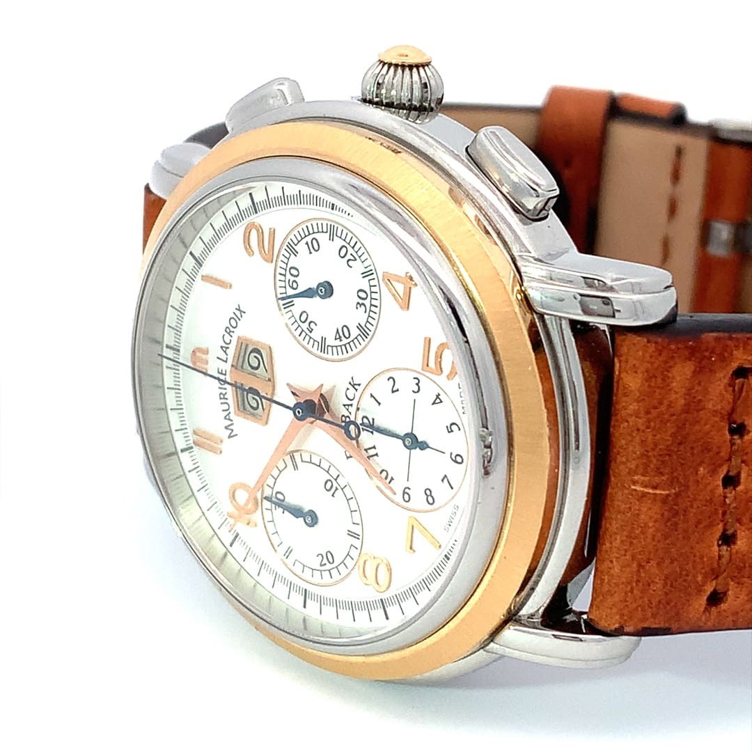 A beautifully designed Maurice Lacroix gents watch with an automatic movement. This is a Masterpiece Flyback chronograph watch in stainless steel with an 18 carat pink gold bezel and crown. The dial has a matt silver background and polished pink-gold numerals and sword hands. Large date window at 12 o’clock. This watch comes with it’s original presentation box and warranty booklet and certificate.