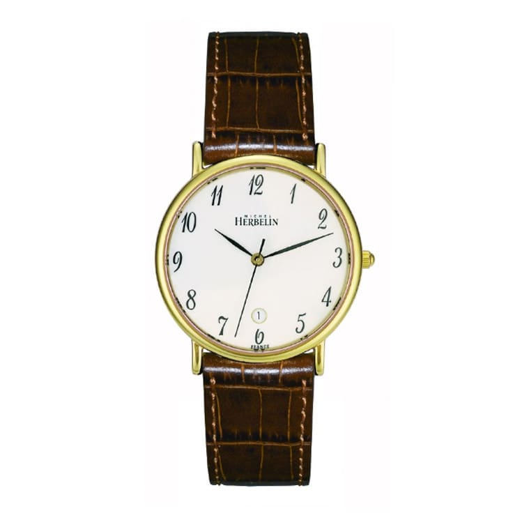 Herbelin gents gold plated Sonates watch with a round crisp white dial with black full figures and a date window above 6 o’clock on a brown croco grain leather strap. Swiss quartz movement. Slim case design.