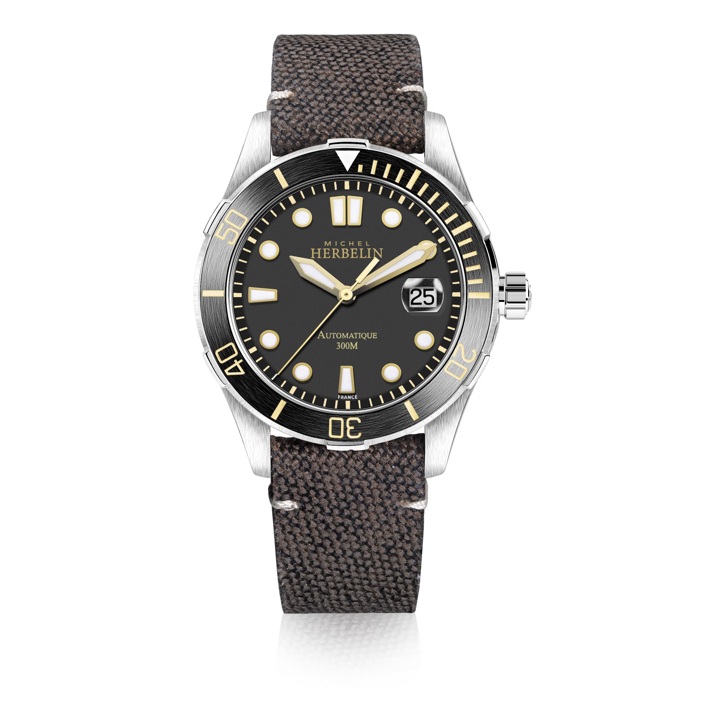 Land and sea come together in the all-terrain Trophy timepiece. The steel case is accentuated by a black ceramic bezel. Against the velvety matte black dial, the golden hour markers create a visual balance that suits this model perfectly. Set on a high-tech strap made of textile and FKM rubber, this Michel Herbelin watch meets all the specs of a professional diving watch water-resistant to 300 metres. It is a distinctive accoutrement for any adventure lover’s wrist.