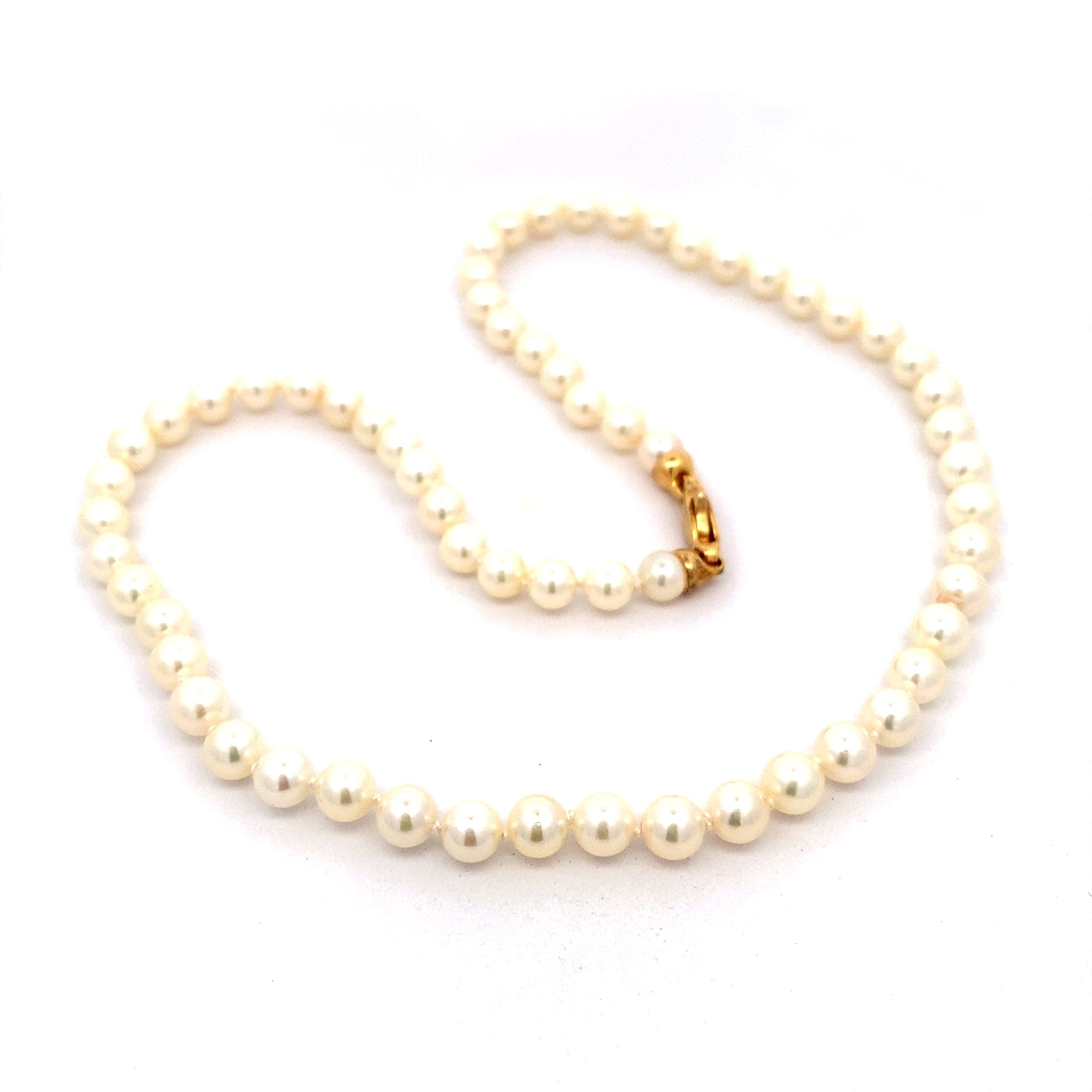A collar length knotted string of AAA akoya pearls with a gold plated silver clasp.  By Mikimoto.
