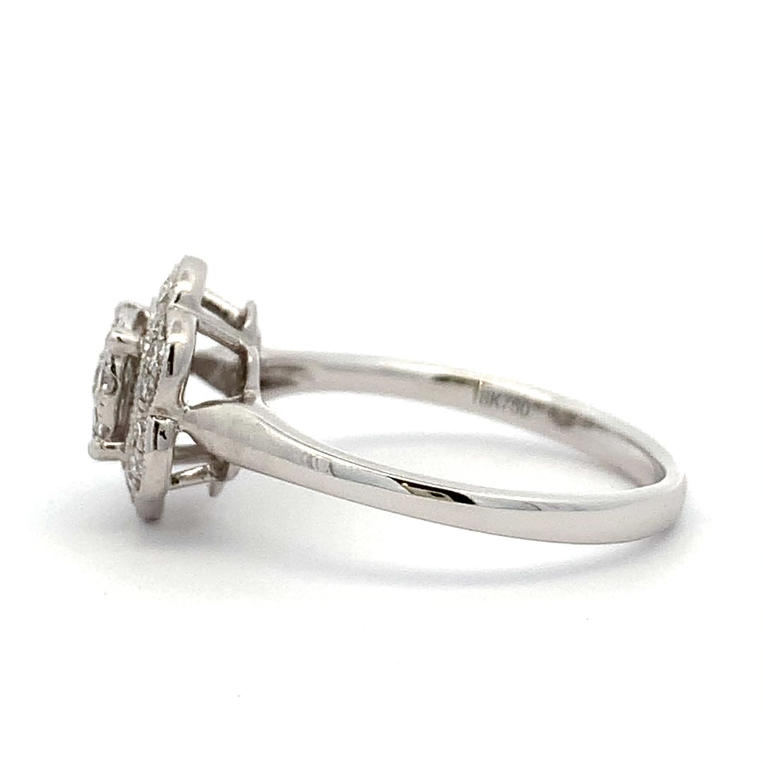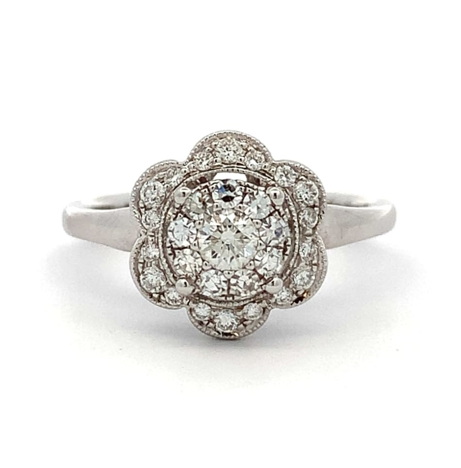 Creating the appearance of a 0.85 carat Diamond, the centre of this pretty flower design ring comprises a brilliant cut Diamond framed within a surround of smaller eight-cut Diamonds. The outer petals are Diamond pave with a milgrain edge.