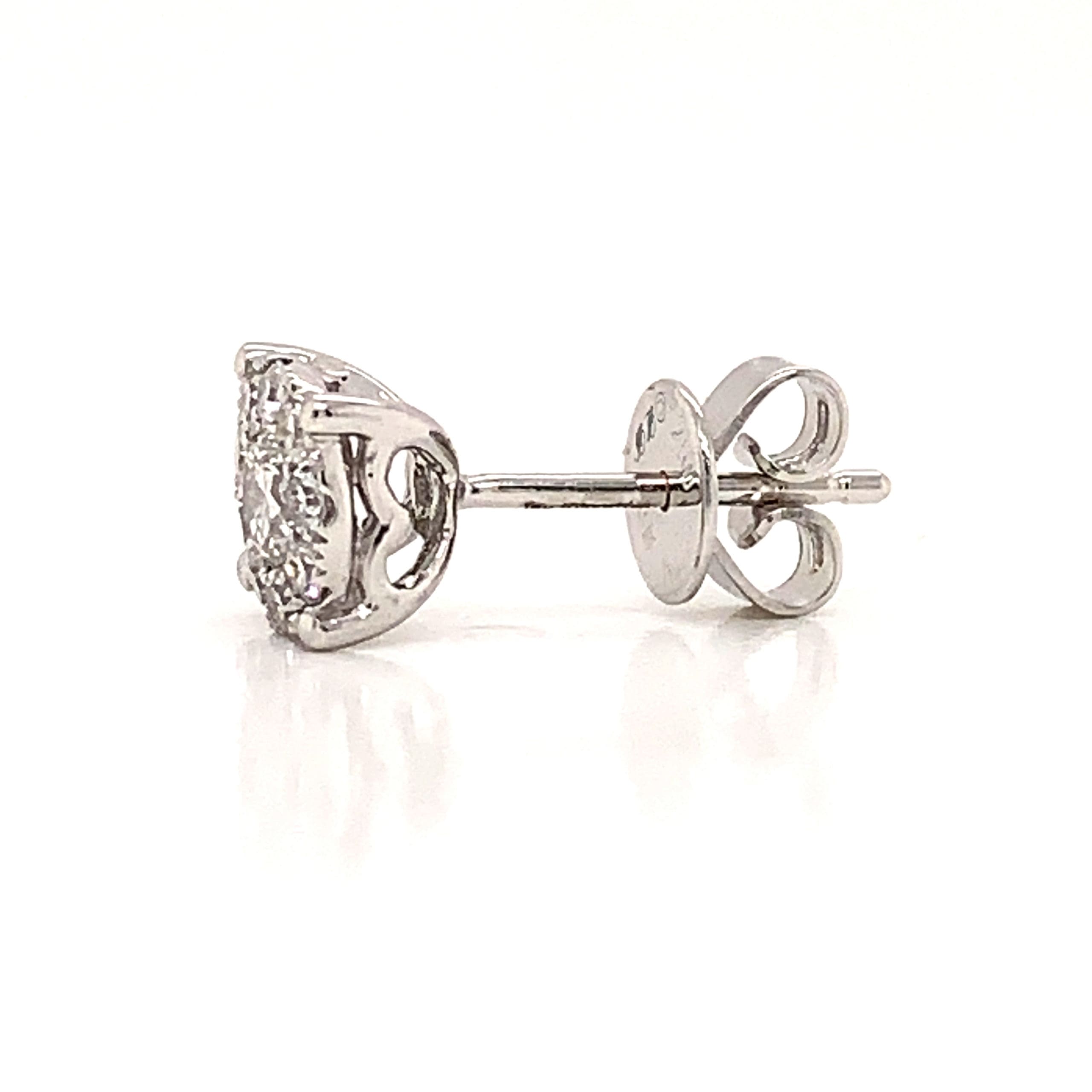 Creating the appearance of a pair of 1.00 carat Diamond studs, these earrings are set with a central brilliant cut Diamond framed within a surround of smaller eight-cut Diamonds. The low profile basket setting is designed to sit closely to the ear.