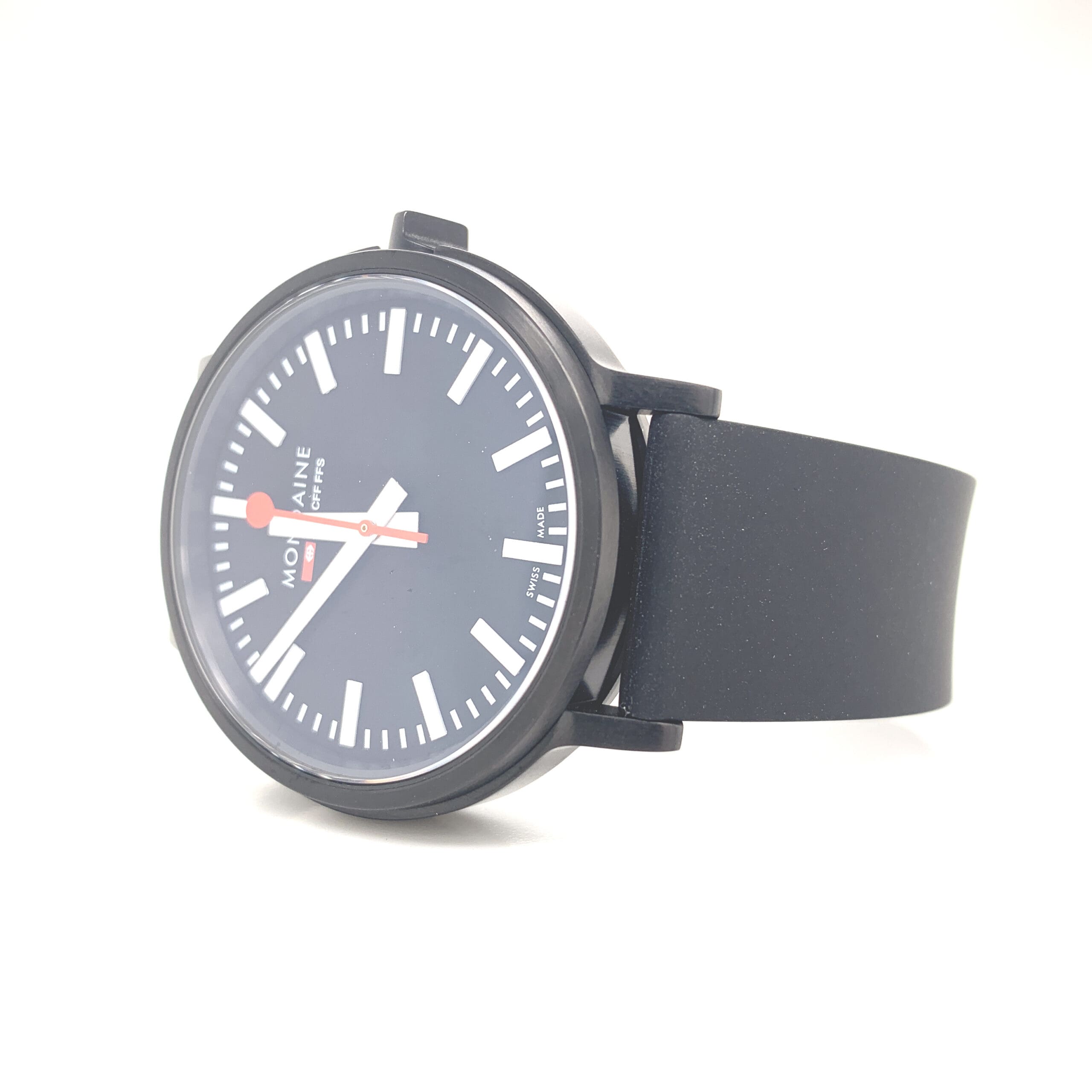 The fascinating execution of stop2go, like on the original clock, features the famous red second hand that turns full circle in 58 seconds and then waits at 12 o’clock for the minute hand to move on, before jumping one marker forwards, starting its next rotation. This is the full black version with white hands and batons. The case is black I.P bonded stainless steel.