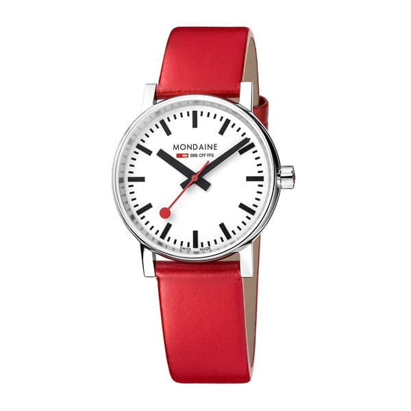 Evolutionary design Thanks to its harmoniously designed case made out of polished stainless steel the Mondaine evo2 is very comfortable to wear. The scratchproof sapphire crystal protects the iconic dial and its prominent red second hand. The ergonomic red crown and the black leather strap highlight Mondaine’s expertise.