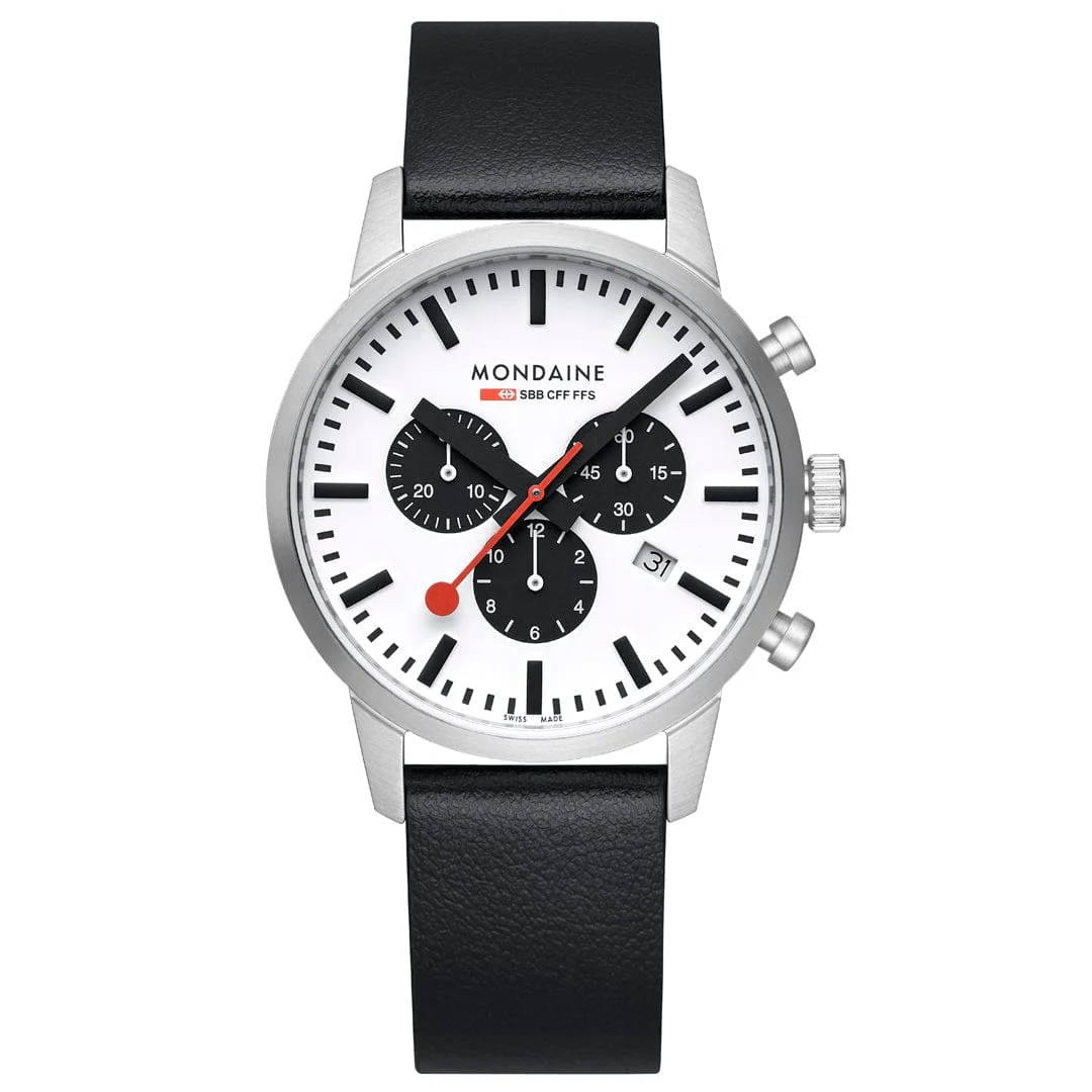 This sophisticated and masculine chronograph seamlessly blends the classic panda dial, a white dial with black sub-dials, with the iconic Swiss Railways station design creating an irresistibly appealing fusion of two watch classics. Just like in the original panda dials, the subdials are in the 3, 6 and 9 o’clock position mimicking the markings of a panda face. The chronograph features a 41mm brushed stainless steel case that introduces a new shape unique to this line and is equipped with a date display and chronograph function allowing the wearer to track the date and measure elapsed time with precision. The dial is protected by sapphire crystal with anti-reflective coating, a strong and scratch resistant material and is paired with a black vegan grape leather strap. Make a statement with this sophisticated and classic timepiece!