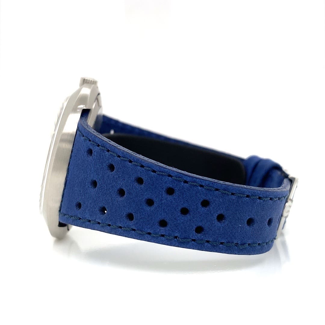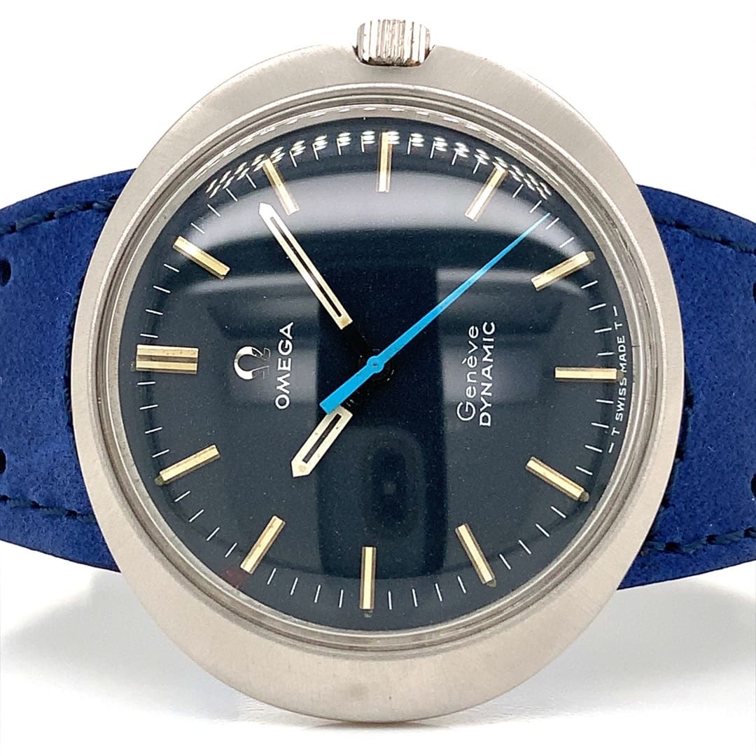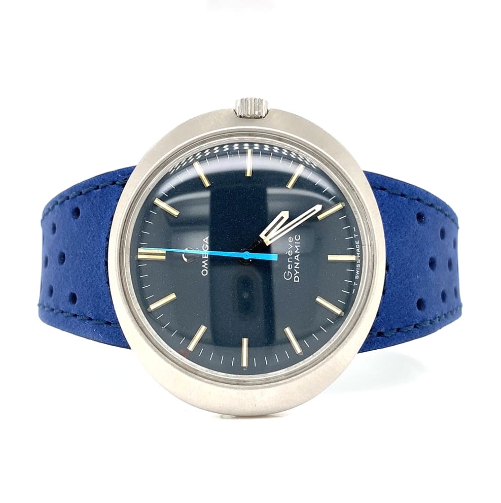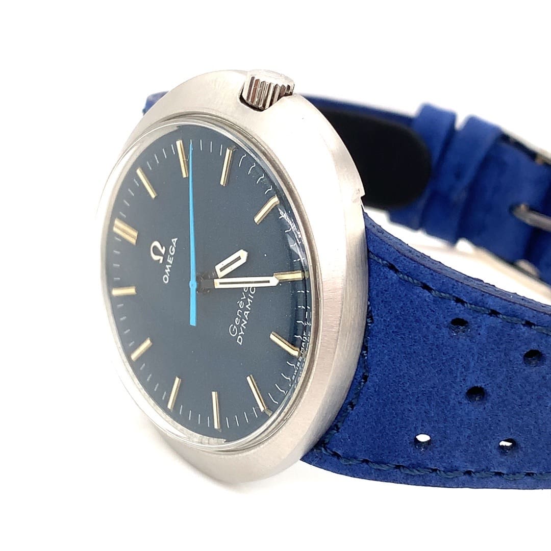 A 1968 – early 70’s Omega stainless steel oval form Dynamic watch powered by a hand-wound mechanical movement. Matt, dark denim blue dial with baton indices and striking blue seconds hand. The oval case protects an inset crown. Fitted with a new integrated nubuck blue strap with original buckle.