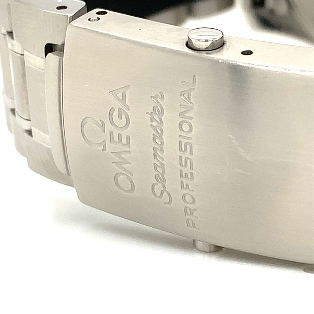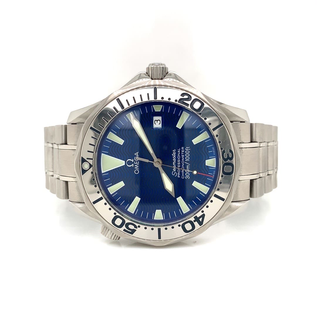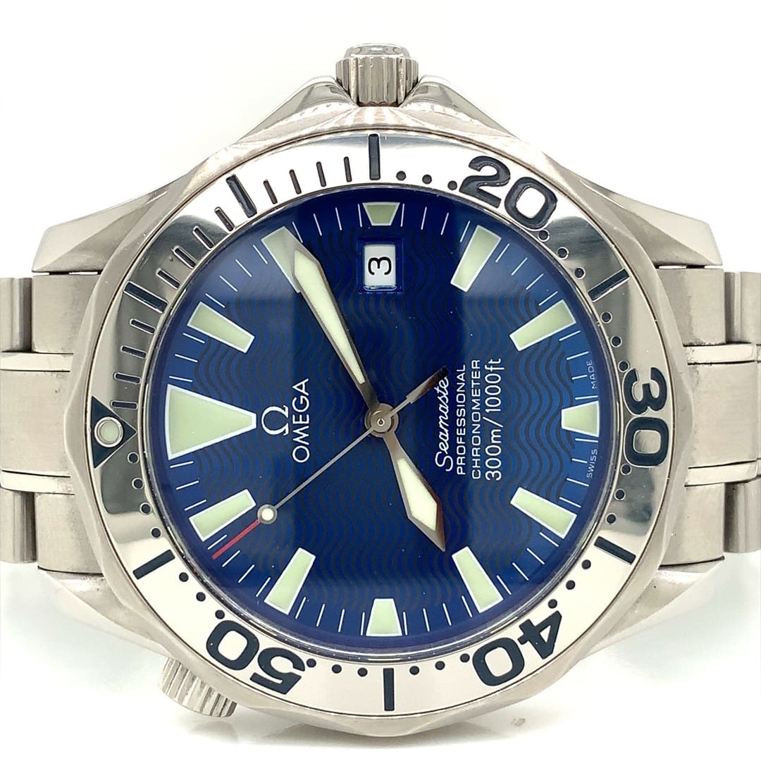 This is an Omega Seamaster steel chronometer watch with automatic movement. Features electric blue enamel in a wave guilloche dial. Bold luminous sword hands and wedge hour markers. Date window at 3 o’clock. Steel bracelet with satin and polished surfaces. Folding button release clasp with expander.