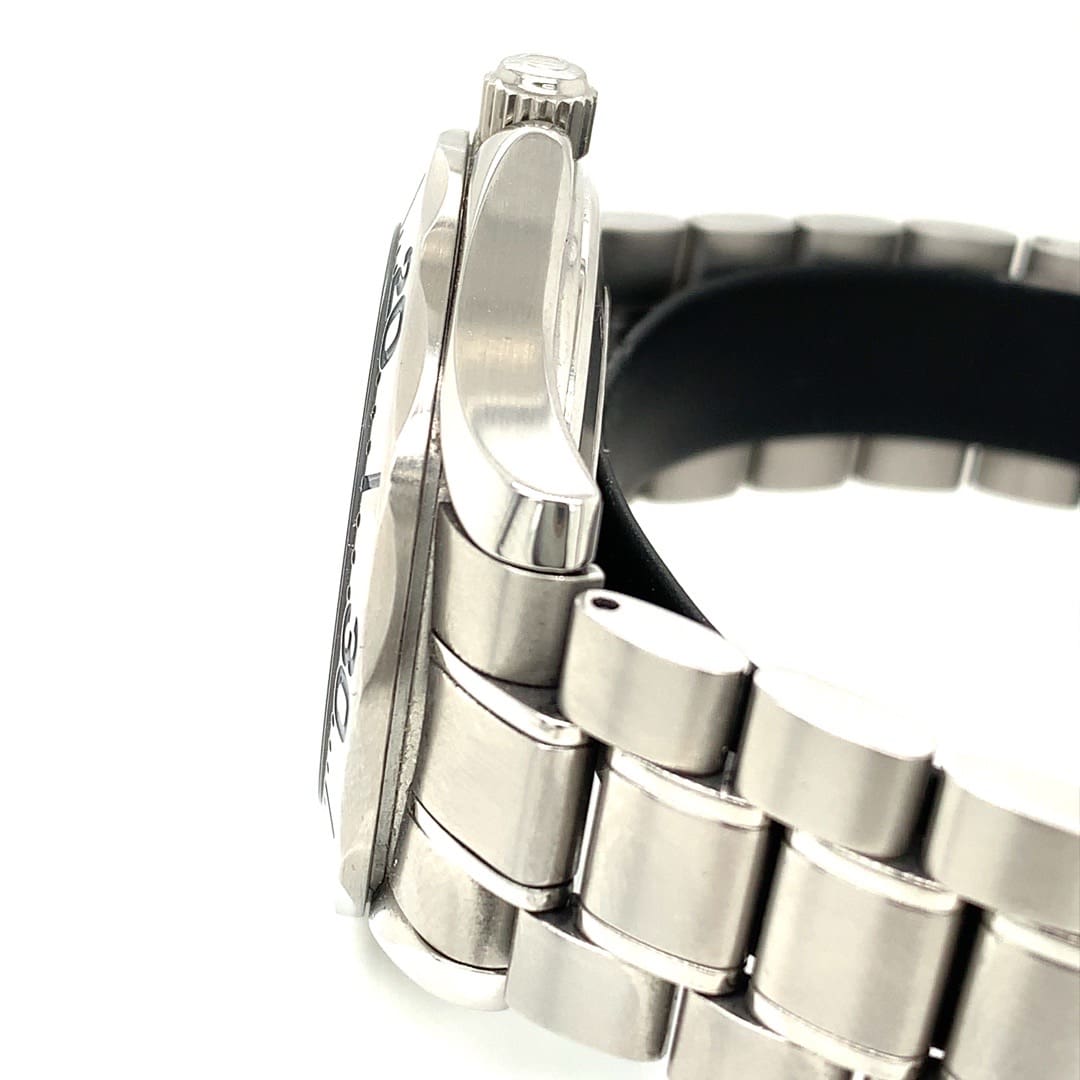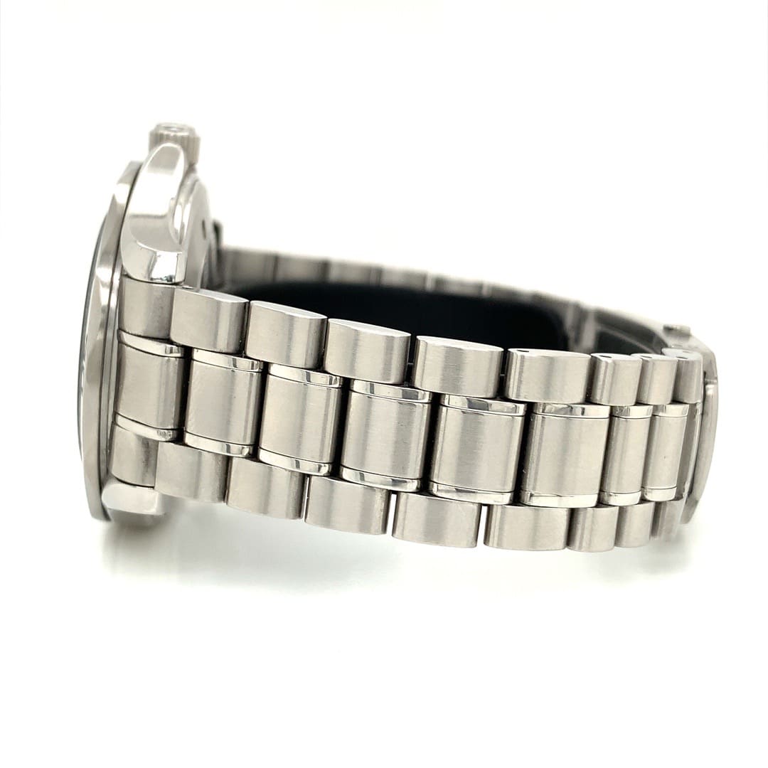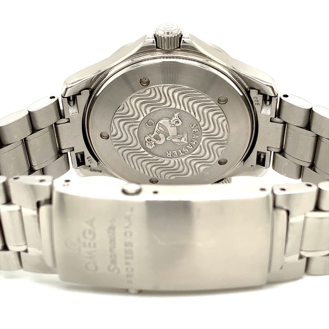 This is an Omega Seamaster steel chronometer watch with automatic movement. Features electric blue enamel in a wave guilloche dial. Bold luminous sword hands and wedge hour markers. Date window at 3 o’clock. Steel bracelet with satin and polished surfaces. Folding button release clasp with expander.