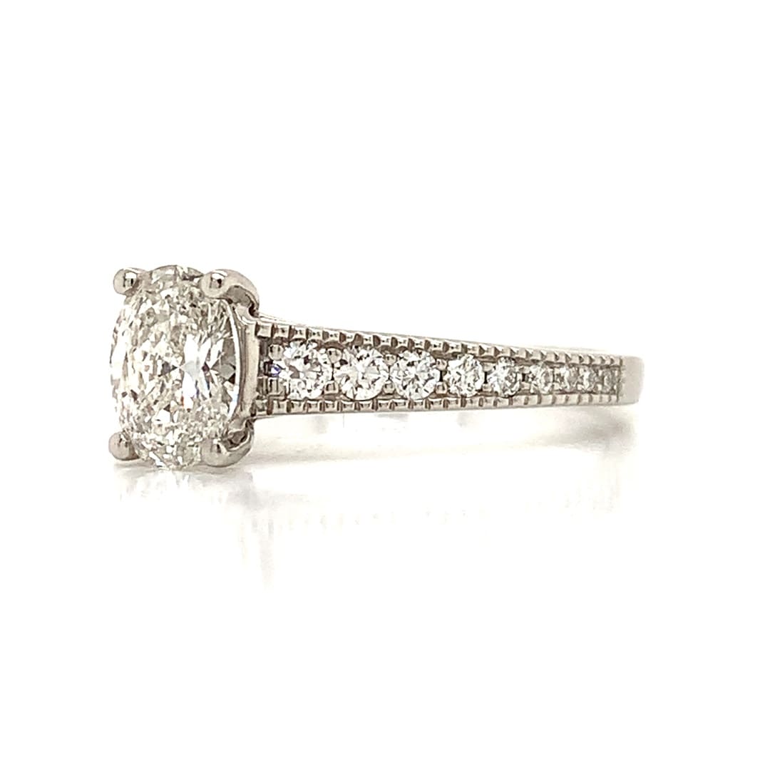 This gorgeous ring has graduated diamond pave shoulders that sweep up to a generous claw set oval cut diamond in a kiss design undersetting.