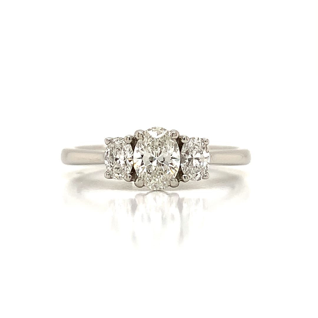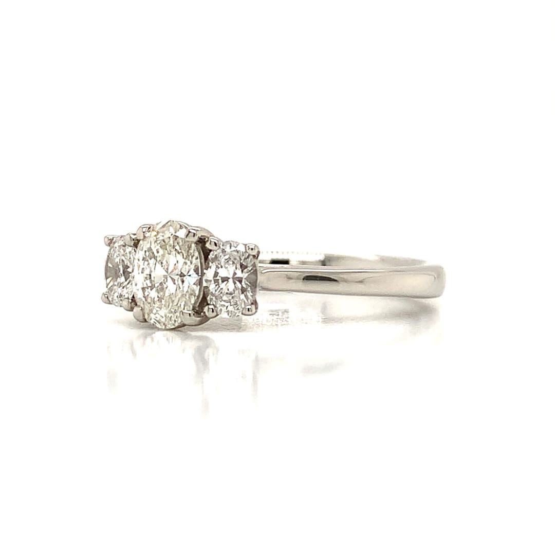 A beautiful trilogy ring claw set with three oval cut diamonds. This platinum ring is designed to allow a wedding band to sit under the setting.